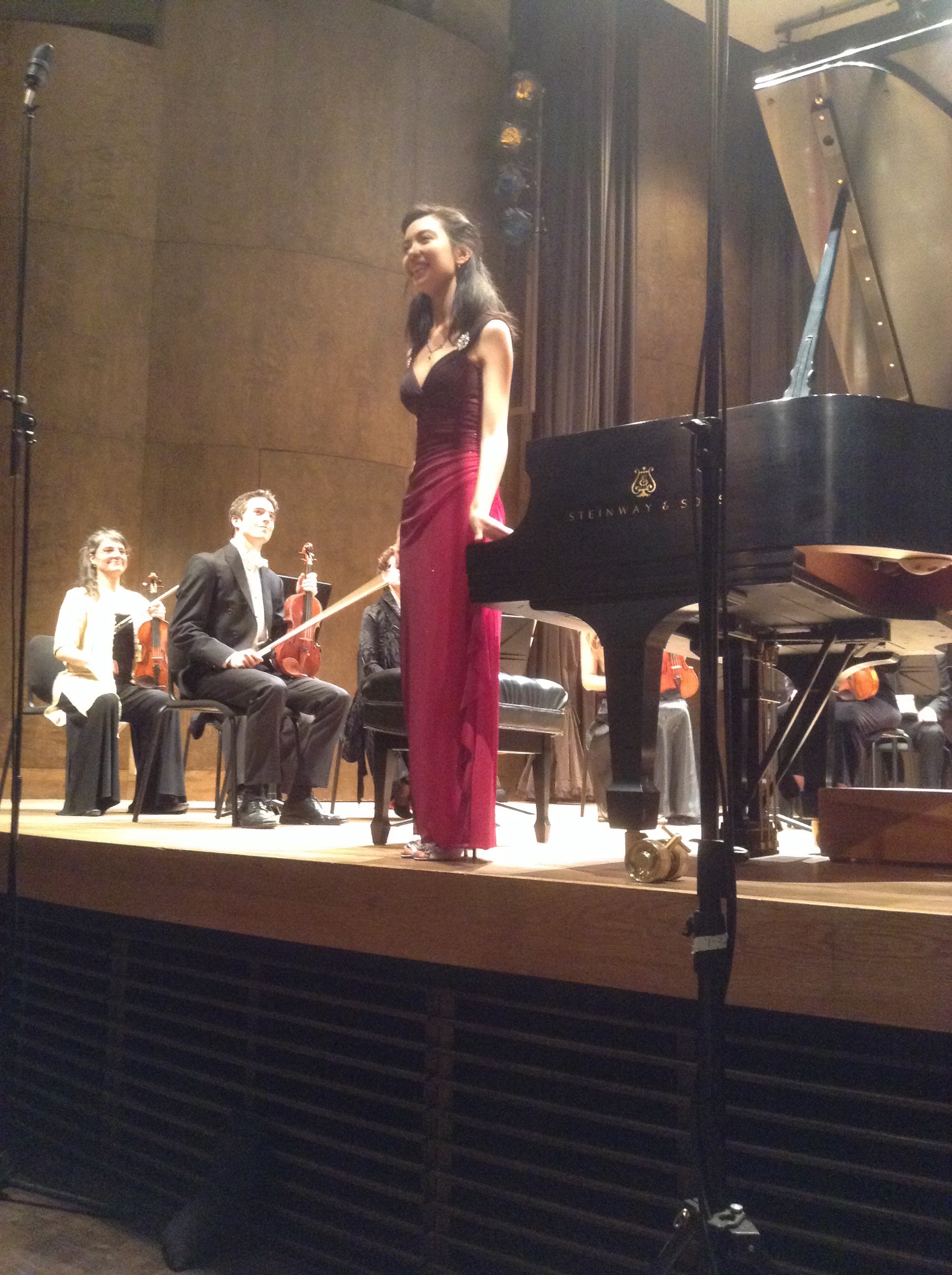 So, the concert was conducted by Boris Brott and featured the McGill Chamber Orchestra with a wonderful soloist. This was a young lady (really young – like 16 years old) who was an absolute viruoso on the cello and on the piano. Her name is ANita Pari and as an encore she played one of her own compositions “Strange Dance” except that it was wonderful rather than strange. She was a tall and slender young lady who wore a beautiful dress of a sparkly red fabric. Anyway, I will post a picture. I am going to write something about the orchestra too. I have to think how to do it. The wonderful thing was that I had been sold a ticket (rather against my will if the truth is to be told) and it turned out to be in the very first row right in the middle. I was a bit shy of my blue pants when I took my seat because I had the feeling I was every bit on show as the orchestra. The program was: Overture to the Creature of Prometheus by Beethoven. I had never heard of this but it was great (Beethoven only does great) Then we had Eine Kleine Nachtmusik. My heart sank to my boots when I saw that on the program as it is soooo overplayed and a bit banal, I think. Anyway, being in the front row changed all that. I could follow the viola and hear the undermelody. I liked it very much. Then we had a cello and orchestra piece with the young Mlle Pari playing the most heart-rendering and technically challenging music you can imagine. I was utterly spellbound – and at this stage it takes something to do that. We had intermission and then a very unusual piece – Symphonic Chocolates. This was a piece in 4 parts by Maxime Goulet, the composer in residence at McGill. It was four movements based on a chocolate taste: Caramel, Dark, Mint and Coffee and they even had little boxes of chocolates – just 4 in each box and you were supposed to eat one for each movement. However they persuaded the Bourgie to let them do that I cannot imagine. They made quite a point of telling us not to drool or wipe our fingers on the seats. After that we had a Mozart concerto that I didn’t know very well, No. 12 in A major. This was another opportunity to drop our jaws (I said Jaws) at the virtuosity of Anita Pari who played the piano as Mozart himself would have wished. She gave us her encore as we clapped and clapped. The conductor, Boris Brott was very gracious and he even told us the hockey score at intermission. So, you see, it turned out very well that I went in spite of my reluctance. The picture on top is of my rose pruning in the morning. So glad it is warming up a little. The picture below is of our soloist. Watch her – she will be a big star. A demain lovies