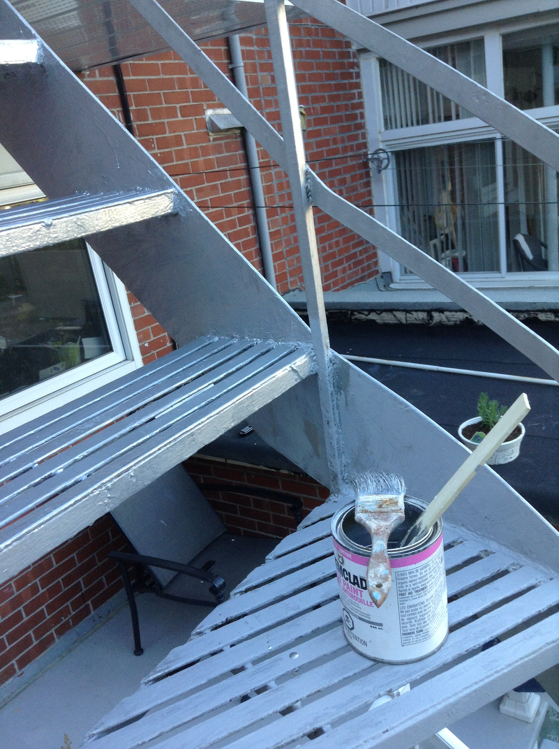 I don’t want to be admired for accomplishing difficult tasks.  I don’t want to be the reliable one, the kind one, the strong uncomplaining one.  On a beautiful summer day I don’t want to spend hours scraping rust off convoluted steps, applying primer and then awful shiny paint.  ( Easy to apply according to friends. . .friends who will admire my work when it is safely complete). In fact aluminum paint is like water, runny and inclined to drip particularly if one has to hold the brush upside down.  To paint the underside of steps one has to hold the brush upside down a good part of the time with the result that I began to look like the Tin  Man in the Wizard of Oz.  That is a cute phrase to make the readers smile but for much of the afternoon yesterday I did not smile.  Quite a few salty tears mixed with the paint, probably impeding it’s rustproofing capacity a little.  That was yesterday’s task.  Today I scrabbled a hole in the lane to plant a lilac bush contributed by the Green Lane movement of the city of  Montreal.  The one I planted two weeks ago was run over.by a large crane that was  installing a ” spa” for my neighbour.  This morning, for five hours we had the crane on one side and some sort of plumbing machine on the other.  I am short tempered and very very sorry for myself because I have to deal with these things..  I want some kind and capable man to “handle” it all.  I am resigning from my customary persona.