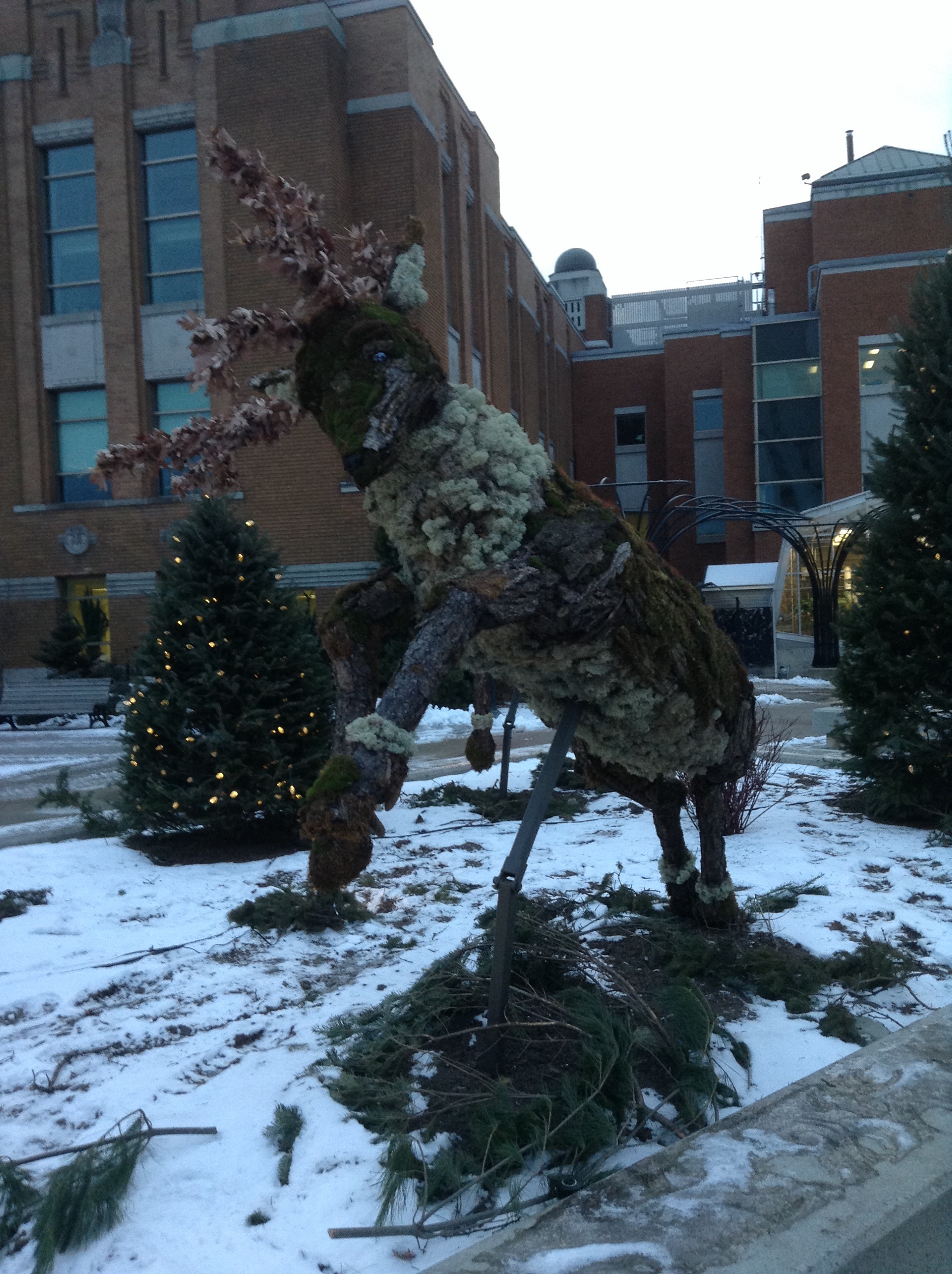 Made my annual trip to the Botanical gardens yesterday and was most impressed by the outside decorations. Caribou made of natural materials- even some caribou moss, white and spongy, pranced around in front of the main entrance. Yesterday was the opening day of the Christmas exhibit and I was surprised at how few visitors there were. The theme was Christmas sweets and the big main hall was decorated with giant kilo pops and cupcakes. The stars of the show every year are the pointsettias and cyclamens and they are very beautiful. I must admit to being a little disappointed. I remembered spectacular shows in the past like the Mexican Christmas, brilliantly coloured with bougainvillea plants draped over lemon walls. I think a better theme might have been to follow the caribou to a woodland hideaway with and Santa’s cottage. I imagine something dark, illuminated with tiny lights. They’ll have to consult me next year. Things are happening a little early for me this year. The rest of the greenhouses worked their usual magic, of course. Isn’t that pitcher plant wonderful?