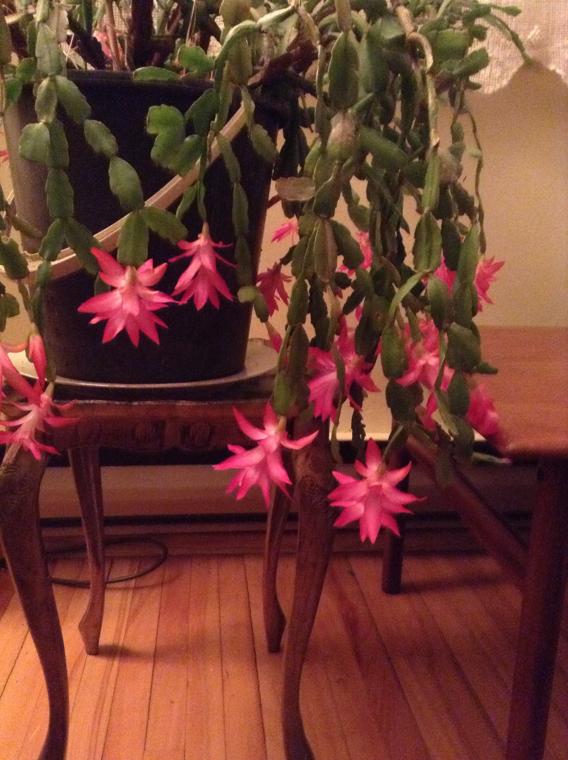 Every year this plant bursts into bloom just before Christmas. I have owned it for many years. Perhaps you can see from the picture that it lives in an old bucket, not a fancy flower pot. Every spring I put it out into the back yard and neglect it for many months. It is the last plant to be watered because I rationalize that it is a succulent after all and it doesn’t need that much water. I leave it out until the last minute and it responds well to a slight frost, forming the tiny pink buds that soon burst into these spectacular blooms. I would be very sorry if anything were to happen to this plant. It has some gnarled, ungainly stems but the sight of those elaborate blooms all over the plant lifts my spirits. It’s like an old, homely friend that has a flash of true beauty just when you need it. Just when I need it.
