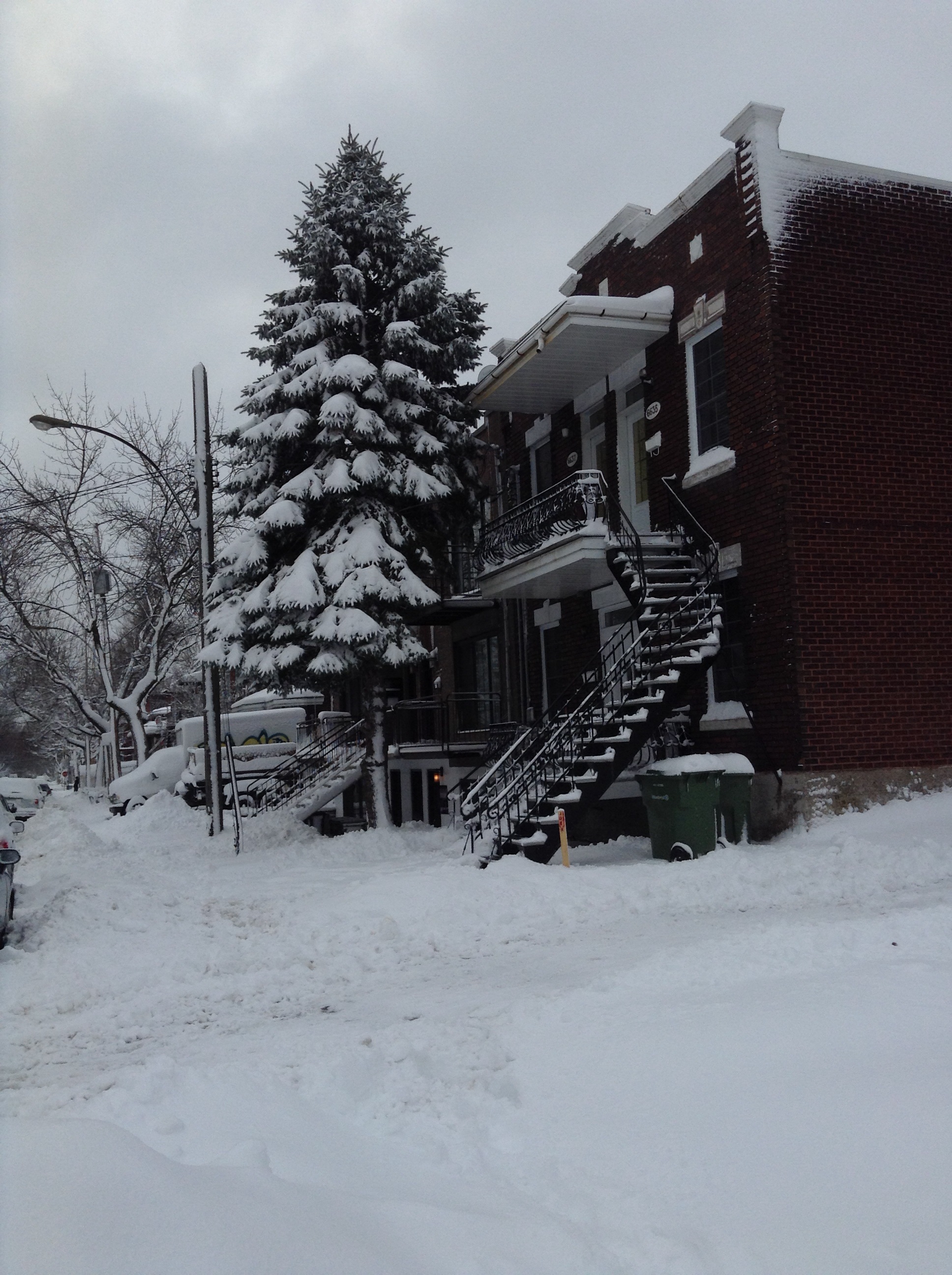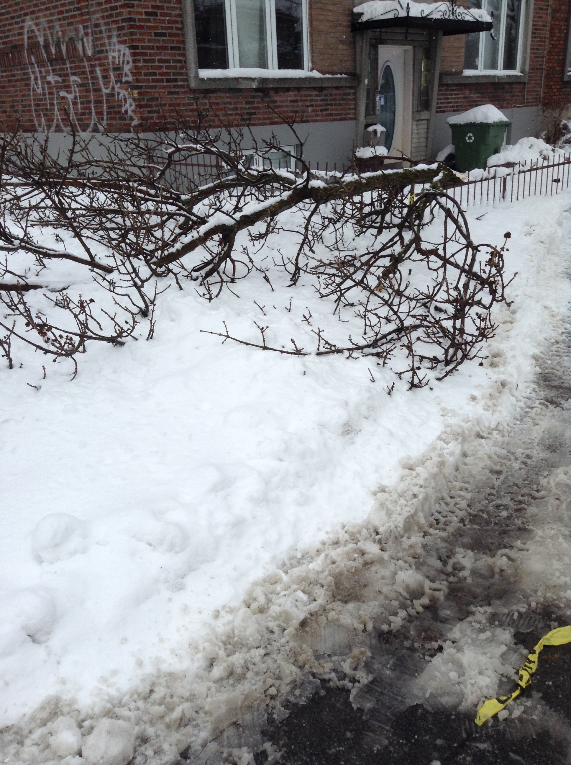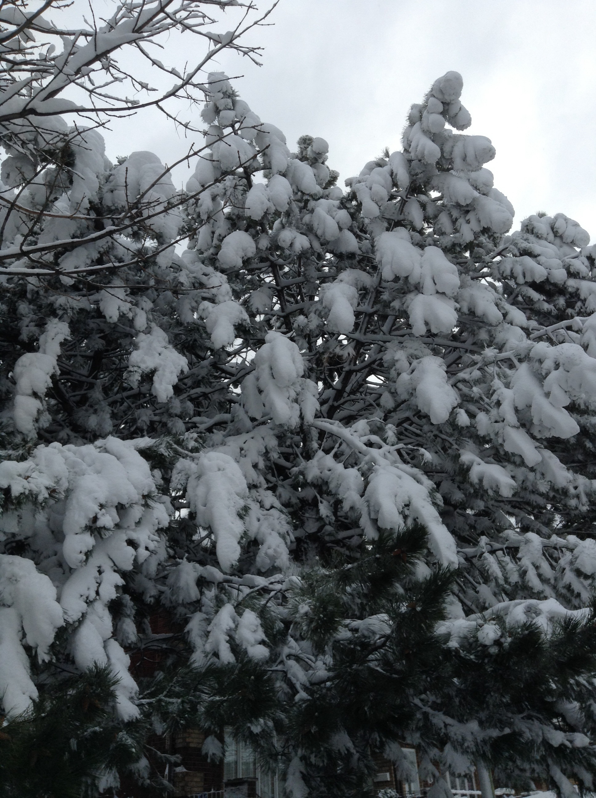We had a heavy snowfall here three days ago. Because the snow was wet and heavy and because we have had little wind, it has settled on trees, wires, poles in a very beautiful way. The way the city looks reminded me of some paintings of Lawren Harris, a Group of Seven artist. I love the way the coniferous trees carry the burden of this strangely persistent snow. Driving around town today I saw some spectacular overhangs from the roofs of buildings too. I drove over the mountain and was rewarded with some spectacular sights of branches and twigs weighed down with snow. I will try to get some images of that tomorrow. Of course, beauty that spectacular exacts a toll.