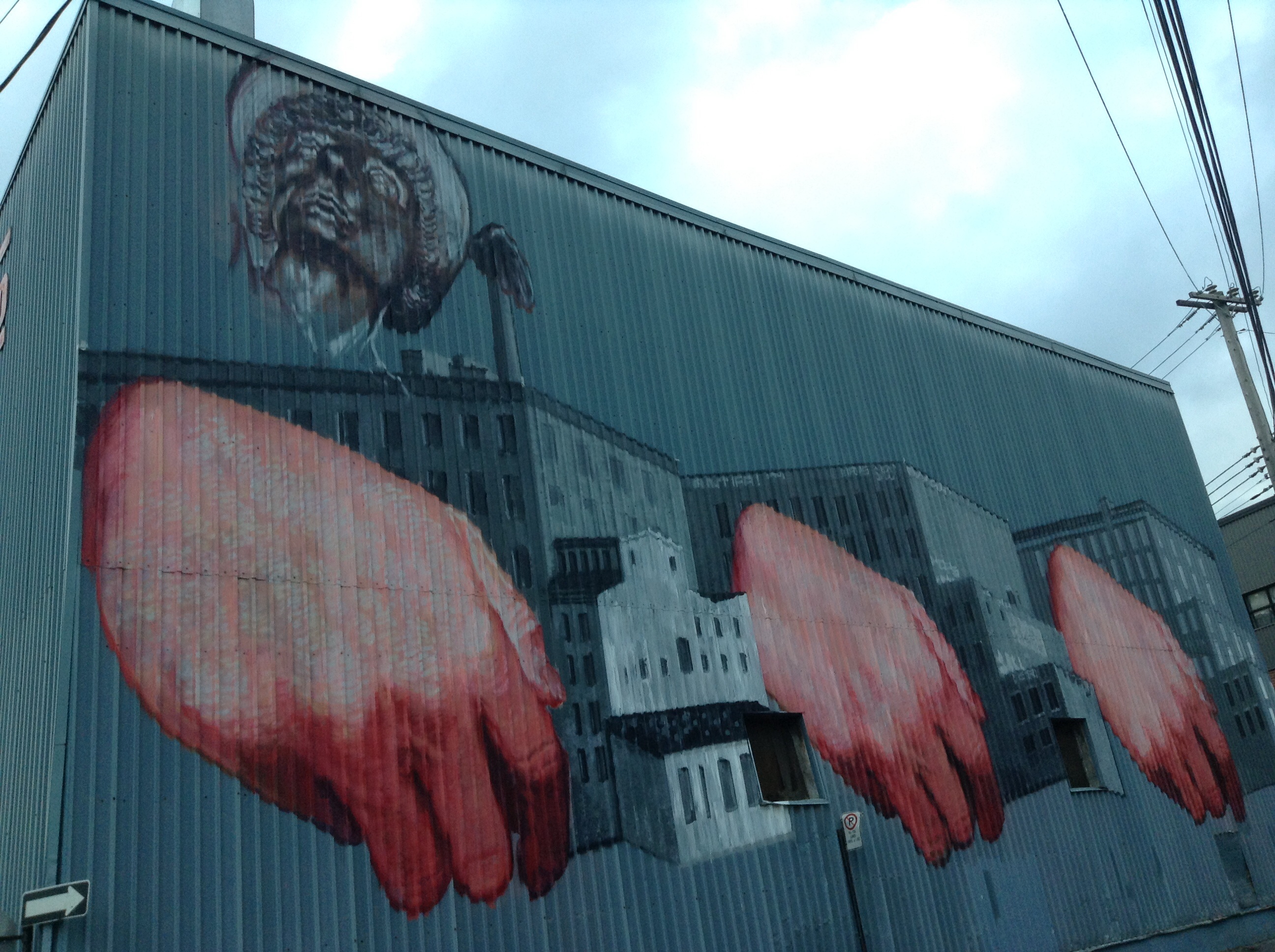 Look what I see in the city around me. Not far from where I live I found this beautiful graffiti. Who does these things, I wonder? Are they commissioned or do people just show up and paint them. You’ll see more of these as I took other photos and will post on slow days. The thing about street art is that all sorts of random things have to be incorporated. The artist has to give up control, work with what she has. Windows, stop signs, even random cars have their place in and around the creation. This artist had to deal with the unusual surface too. Corrugated siding must be quite a challenge! Montreal has great graffiti. Just keep your eye open. Stop the car sometimes and get out to have a look. Cheers.