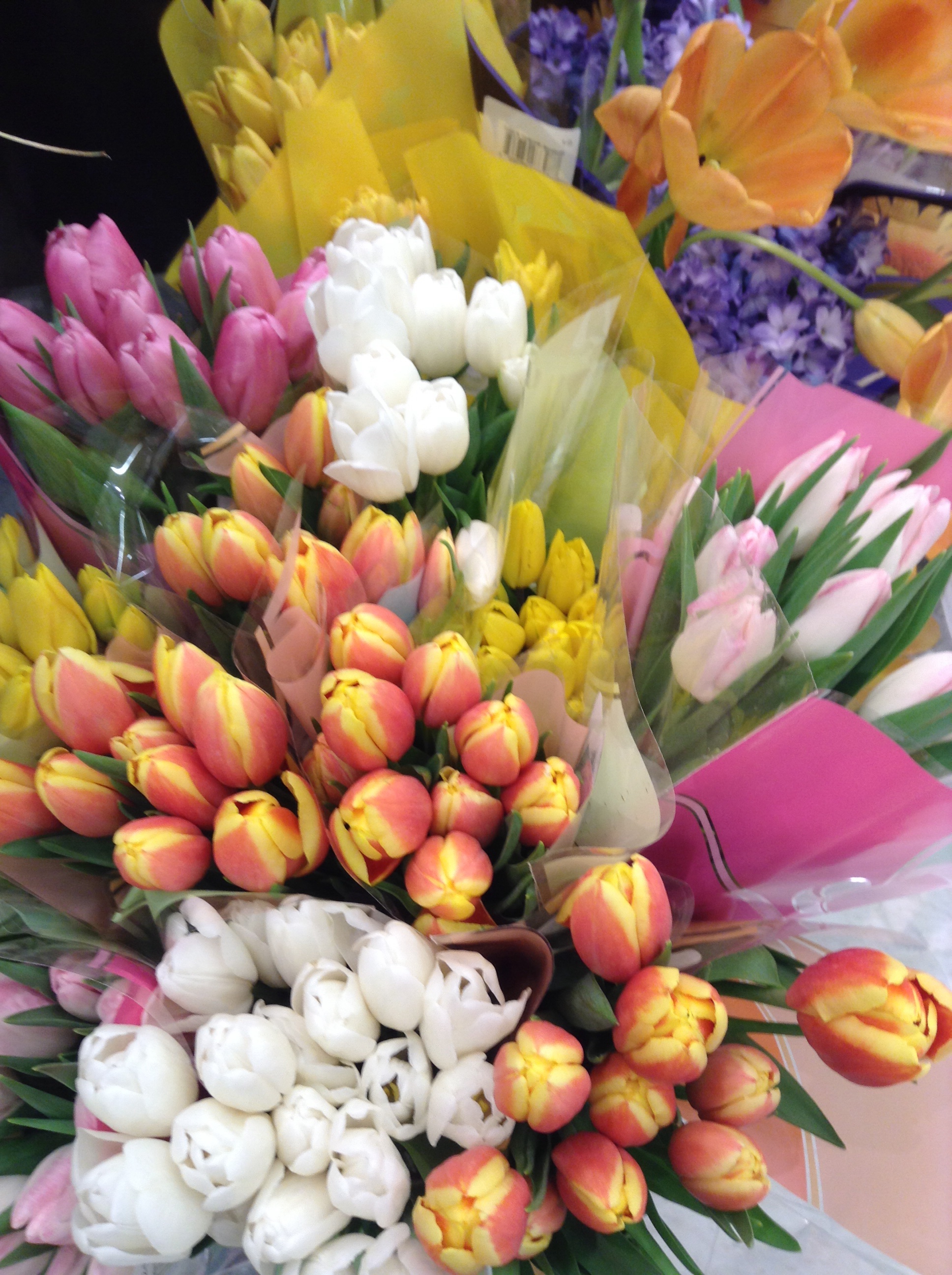 But the marketing gurus in the stores are determined to turn over a new leaf ( even if the blasted leafless trees are waving their desperate branches in the gale-force winds). They know that we cannot resist. They offer artificial forsythia, apple blossoms and peonies. Well, there I thought they were going a bit far. But better than the made in China falsies, there they were – spring flowers, seducing shoppers to spend their grocery money on their soft, pastel faces, their silky petals and to hell with cheese and hamburger meat. The only snag was that the perilous journey to the car would last more than the two minutes it would to freeze them to a tragic death. I sniffed, touched and photographed. But I know it is soon, too soon for this to be true. This week in the grocery store, hope is on special.