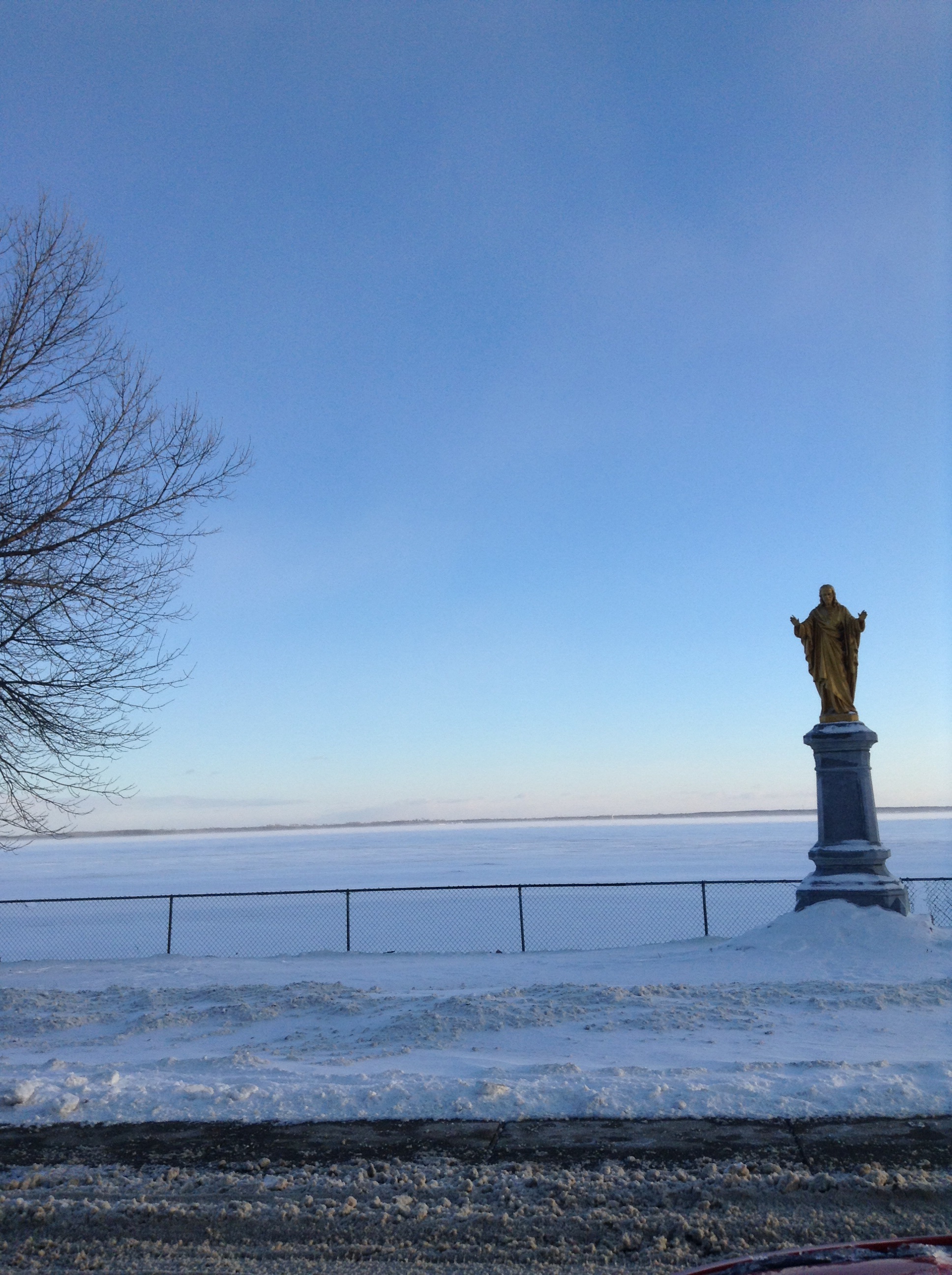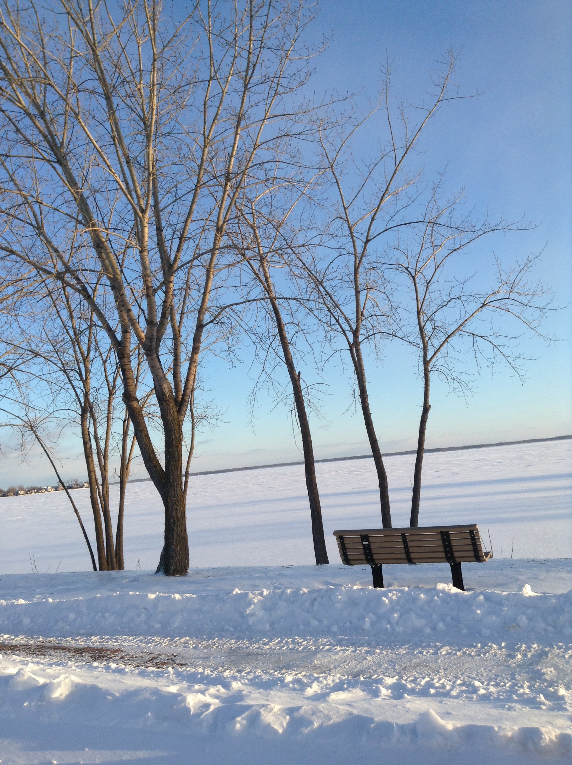 How things are stripped down in winter.  The exuberant green foliage of trees and bushes is totally absent.  Few birds sing.  All the details of houses and gardens are swathed in snow, flattened out, smoothed, obscured so that only streamlined shapes are visible.  My hearing is affected because sounds are muffled by the snow and by my big hood, lined with soft velvet and trimmed around the face with black fur so that I look out into the white world through a fine fringe.  Even on sunny days the sun is low and rather than enhancing my sight, it is dazzling.  The world is reduced to white, light, straight lines. Where the great river widens the waves have disappeared.  The water has frozen.  I suppose one could walk out onto the snow that has fallen over the thick ice but no one braves the windswept open space.  Where would one walk to?  What would be the goal? On such days I often think about the pioneers, the brave or desperate few who took their chances.  How they must have clung to the little comforts they had.  Faith, hope, religion arrayed against nature.  Indifferent nature must have seemed powerful against ideas, theories, dreams.  How I admire them and thank them, send good thoughts to their memory.  On the bitter afternoon I can stand beside the great expanse of water and take a photograph or two and retreat to my car, drive home and drink “a nice cup of tea”.