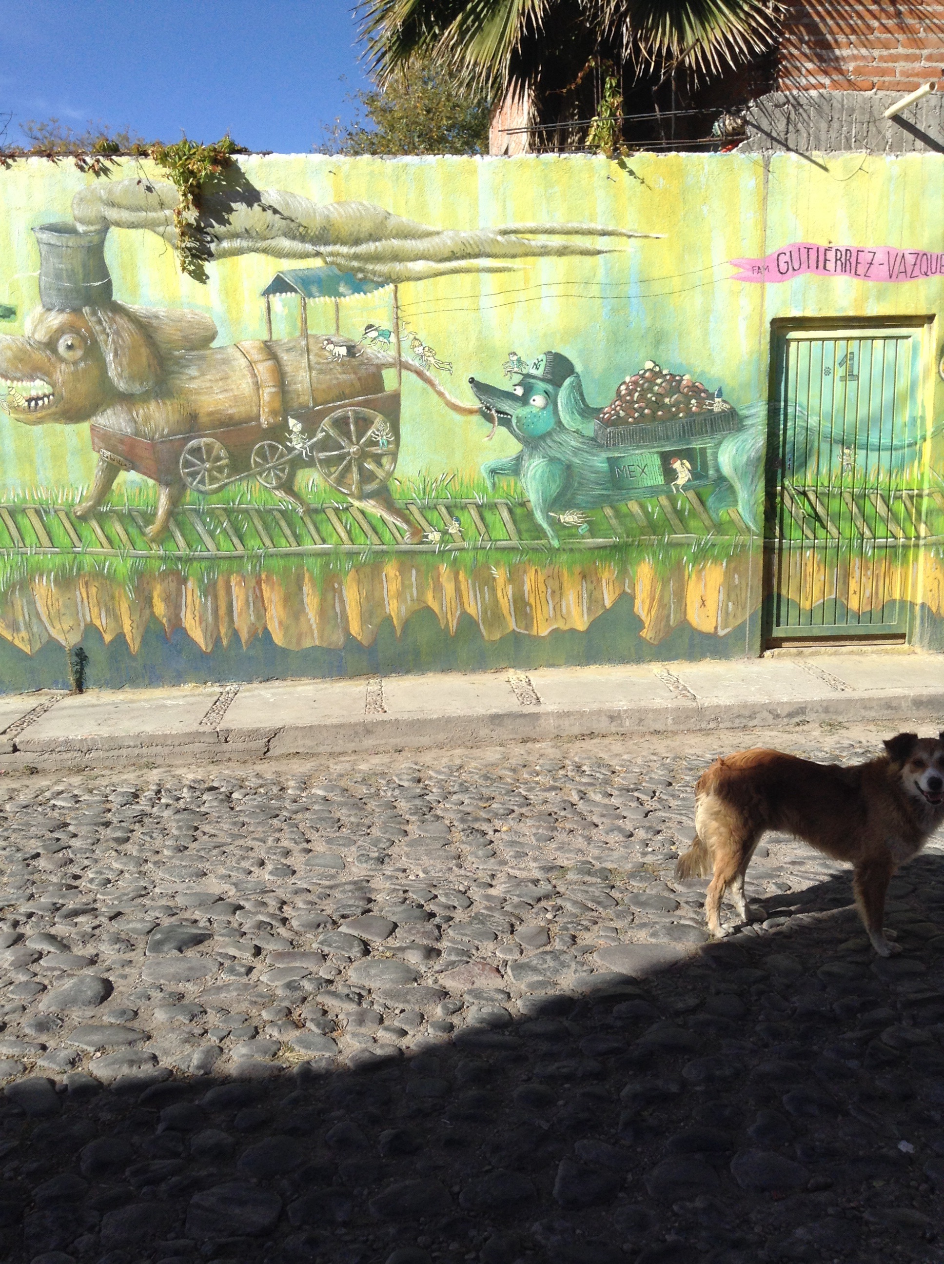 Don’t have the patience, I guess. You think there’s a family resemblance? Maybe, I don’t see it myself. Of course, we’re a little vague on the subject of paternity. Not like our gringo friends who come down with their masters or mistresses. I wonder who has the better life. They have a full bowl of something from a bag each day and attention from their owners. Not that I’d want the attention some of the males get from a sort of dog doctor they go to. Even the senioritas I hear, beautiful some of those poodles, but well. . . no pungent spark if you get my meaning. Ah, San Miguel is full of wonderful smells which can make for a long walk around the town for some dogs on a leash. I’m proud to say I’ve never been tied up. I have hard times in winter when the restaurants are quiet and it is cold but I’m a humble fellow and I curl up with my amigos ( or amigas! Carramba!) and wait out the short winter. Fleas? They are a bother but a good scratch and a dust bath does wonders. Even my famous brother who has grown fat on the wall sometimes creeps down and barks at night to wake the gringos. . . Just for the hell of it. Viva free doggies!
