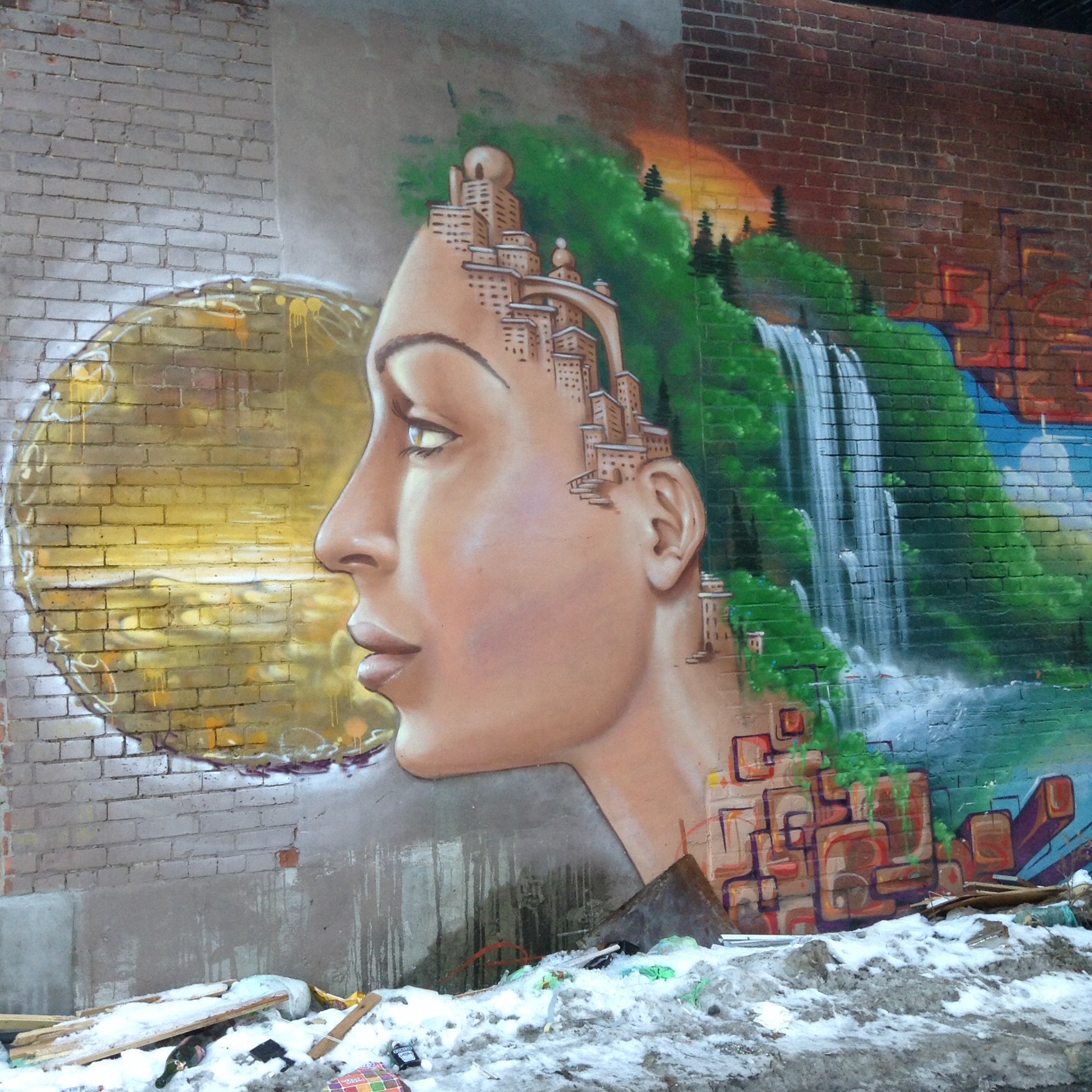I really like this graffiti with its blending of the personal and the city, even the universal. I tried to angle the camera so the image wouldn’t show the mess and debris below but then I thought, well, that’s part of living in the city too. In that neighborhood there are trendy bars and boutiques facing the street front. This interesting bit of art is poked away in a back alley. People threw garbage back here all winter and now with the slow melting of snow, all is revealed. Good thing she is a calm and serene woman!