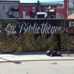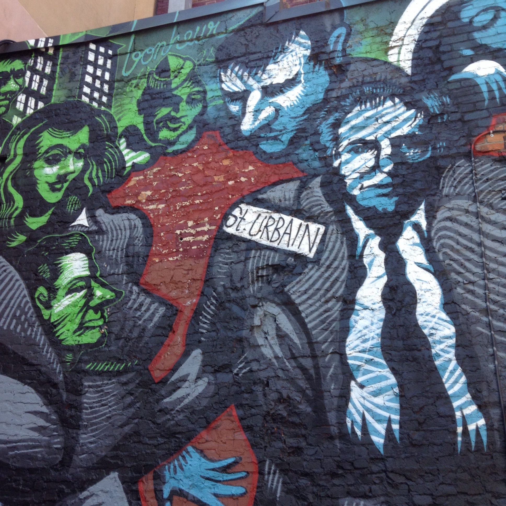 I went to exercise class and to the National Library that is close to my Pilates Studio. I noticed really nice graffiti on the walls of buildings in the alley backing onto he library. I took a few pictures. I smirked to see a beautiful piece incorporating the names of many famous writers that ended up with a commercial sign for “danseuses nues”. There, so much for your high falautin’ culture. People will do what they want. There were a lot of good pieces down the alleyway and I walked all the way down. I was surprised to see a needle disposal box and wondered what went on in the park adjoining the library. The long distance bus terminal is across the street too. A lot of desperate people come out of there. It was a lovely day and I was in a good space. I almost tripped over a young man sitting under a portrayal of children’s’ literature. He hardly noticed. He was ernestly seeking a good vein and tutting over some pretty nasty tracks on his arm. I left quickly and went into the library to find my books, my films, my music. I left that boy next to the big palace of culture, of civilization. I left him without a word because I was afraid of him. Truthfully, I think he would not have welcomed my interruption. That is not the point, is it? I’m sitting out in my quiet little back yard. Flowers are out, birds are singing and nesting. I have plenty to read and to listen to. I have plenty to write. I am a little disturbed by my neighbors who never stop ” improving” the adjoining yard, but there is no accounting for taste. I like my little bucolic wilderness. They like little Las Vagas. We all have our peace and quiet here in our ordinary neighborhood. But that boy under the mural? What is he doing tonight.? Did he find a good vein? Did he throw his needle I. The box ” reserved for that purpose”? Is his soul quiet tonight? Is mine?