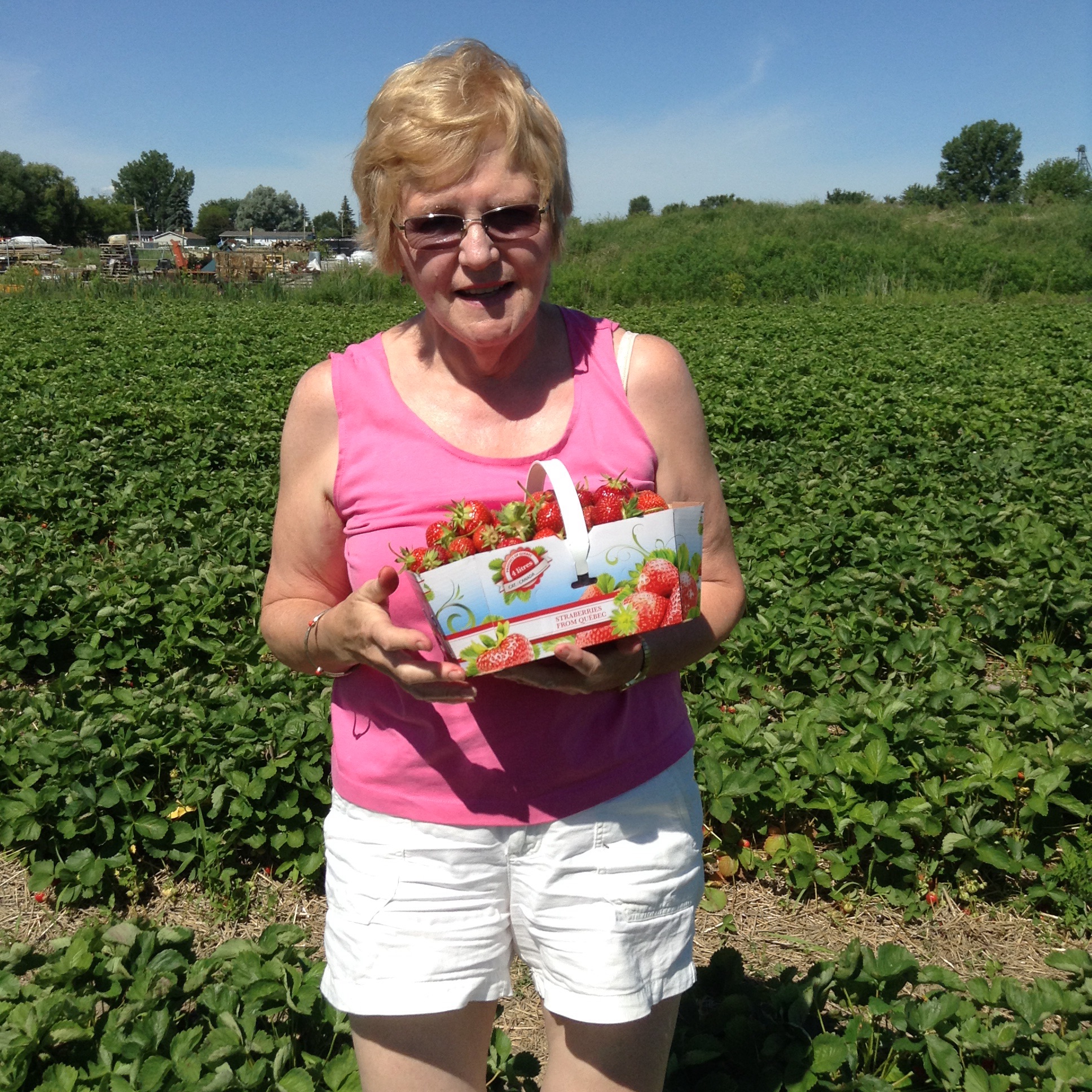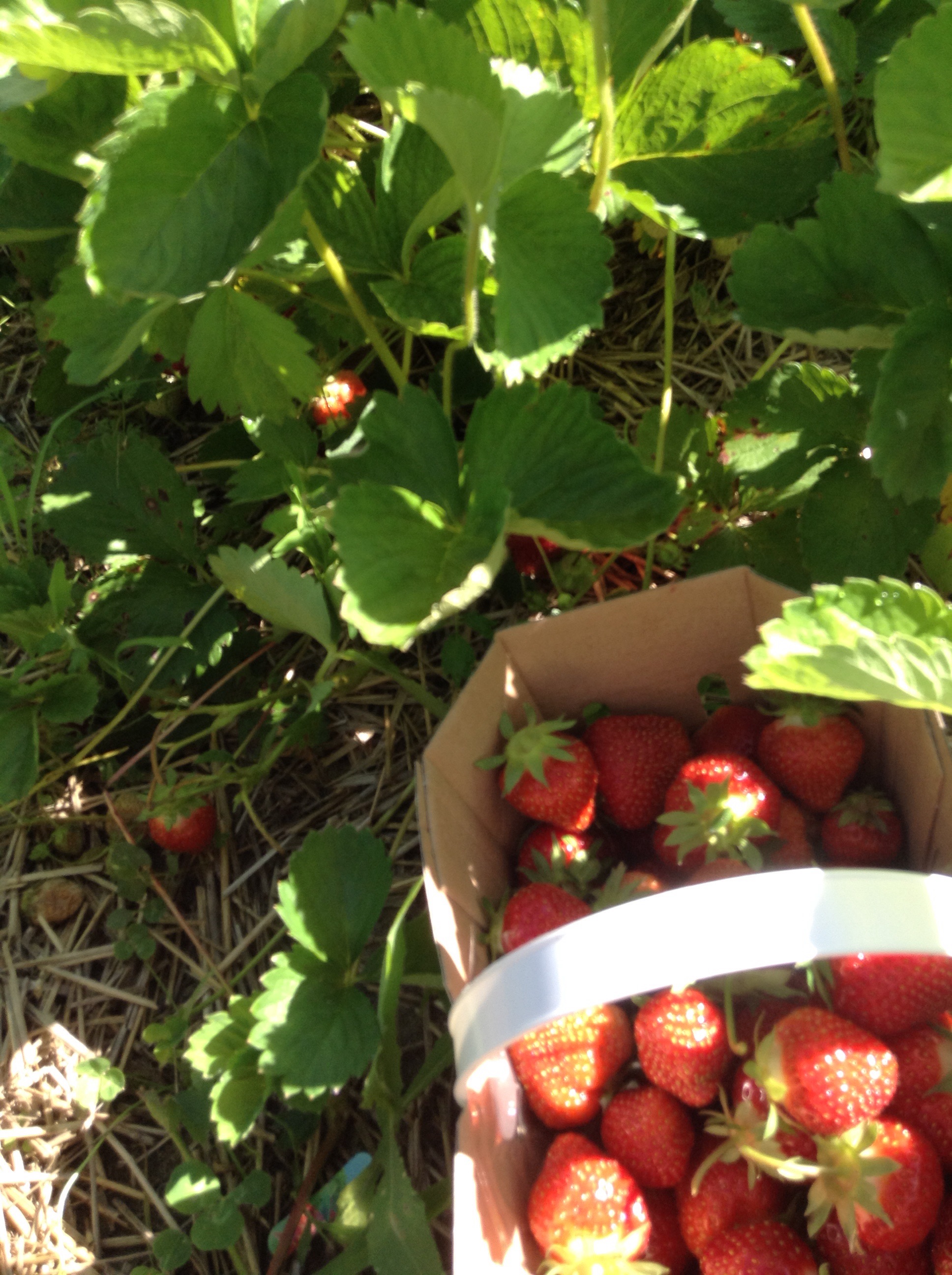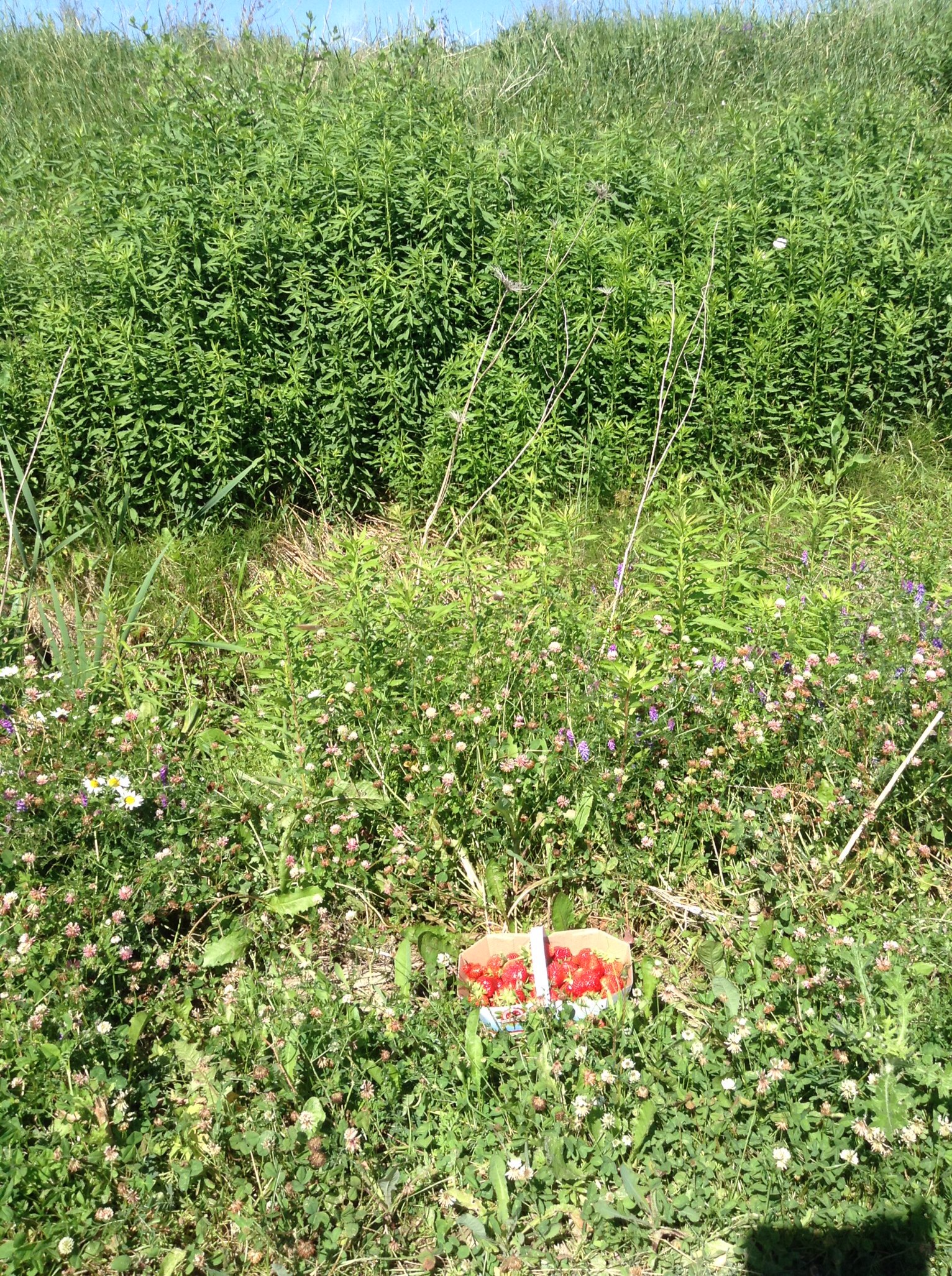 I had never been strawberry picking until today. A kind friend and her daughter took me. We were accompanied by a delightful 2 year old girl who was very good about respecting the rows. We went out of the city to the big river plain of the St. Lawrence where a lot of the produce that feeds the city is grown. It is best to go early in the day as there is no shade and the sun beats down without mercy. Today there was a kind breeze so my hat, forgotten in another car, was not missed. The farm is what is known as a “u- pick” which means that you can buy a basket and spend as much or as little time as you want filling it. You can eat as many strawberries as you like too! There were plenty of pickers, domestics like us and down at the end of the field, professionals. They wore sensible hats and never lifted their eyes to the amazing little white clouds that sat cheekily in the sky like something out of a surrealist painting. There was a school bus that obviously shuttled them to and out of the fields and a bored looking man sat in a lawn chair and watched them? supervised them? made sure they didn’t wander away? You can see that the fruit is quite big. There are clusters and the individual fruits ripen at different times so picking will certainly go on for another couple of weeks. The edges of the fields are full of wild flowers and I wonder how the farmer keeps down weeds. Herbicides? I must hope that the straw( strawberries, right?) keeps them down. I came home and washed and froze them. I liked doing it….next blueberries.