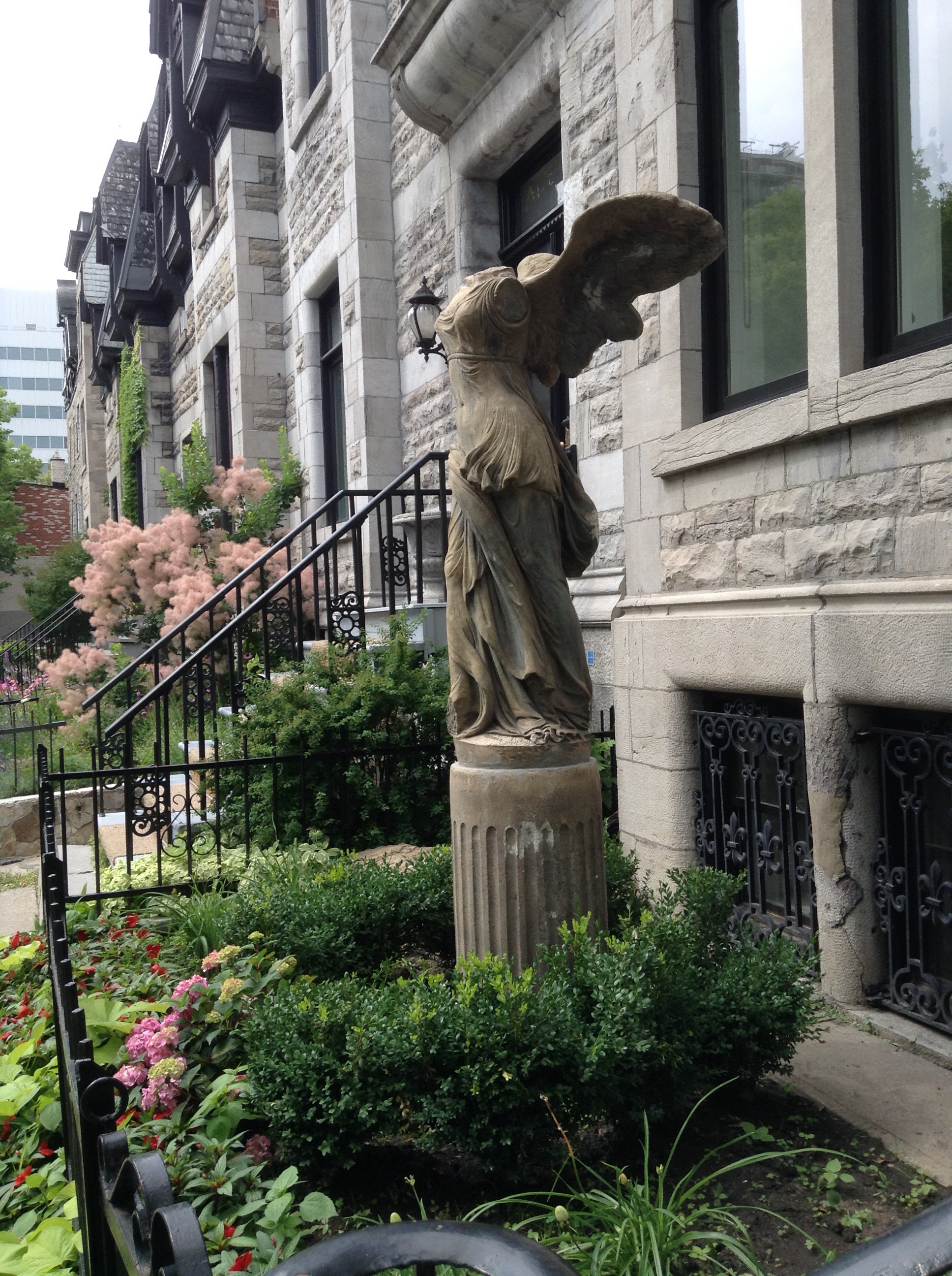 In winter I was posting a little about graffiti. There are some great examples here in Montreal but over the past week or so, I’ve been surprised by the great public sculpture around town. Here are two pretty classic examples. The beautiful copy of the winged victory of Samothrace was a total surprise. Montreal’s long summer construction projects forced me to take an unusual shortcut down a very beautiful little street close to Tupper St. ( the old Montreal Children’s’ Hospital area). As you can see they have a more mysterious and obscure figure peering over the upstairs balcony. Can’t tell you who this is.