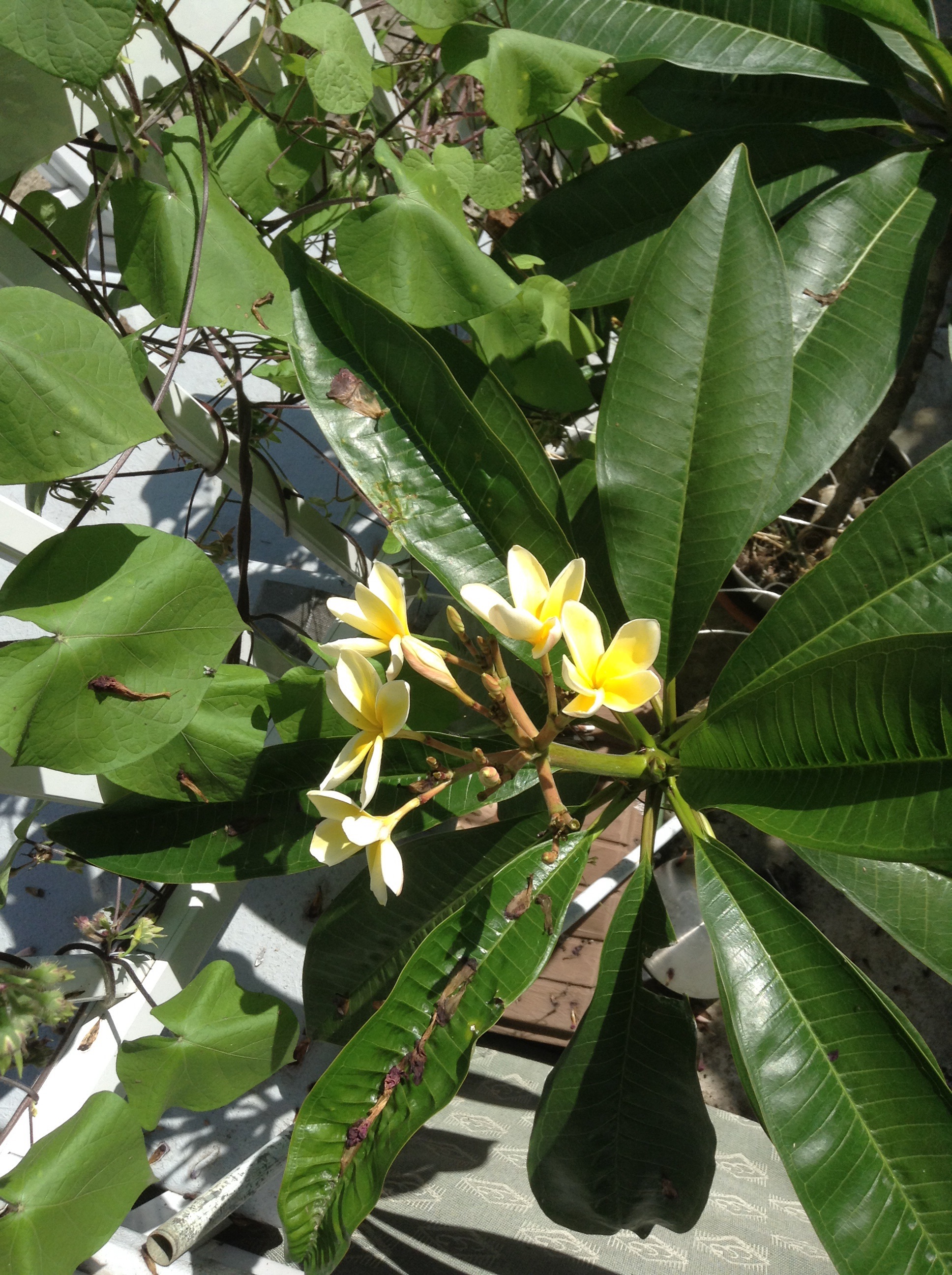 Some of you know I’ve been coaxing a frangipani to bloom and having some success thanks to the miraculous weather. However, to my great surprise when I looked around my yard a couple of days ago I discovered a huge sunflower that I had completely overlooked. How,can you miss a thing like this? My theory is ….”low expectations”. I never liked sunflowers much and this is the first year I have ever grown them. After a spring clean up, I noticed a few cinder blocks in a neglected corner of the yard. They were too heavy for me to carry off so I filled them with earth and popped in a couple of sunflower seeds. Even these were bargain basement seeds I had picked up in a junk shop. I didn’t expect them to grow, I didn’t particularly want them to grow. They were in a shady corner of the yard. I concentrated on other things. However, one seed decided to surprise me, to survive, to excel. While I was fretting over my Hawaiian beauty, this gangly thing shone…and shines in my garden. Draw the lesson….i won’t bore you….