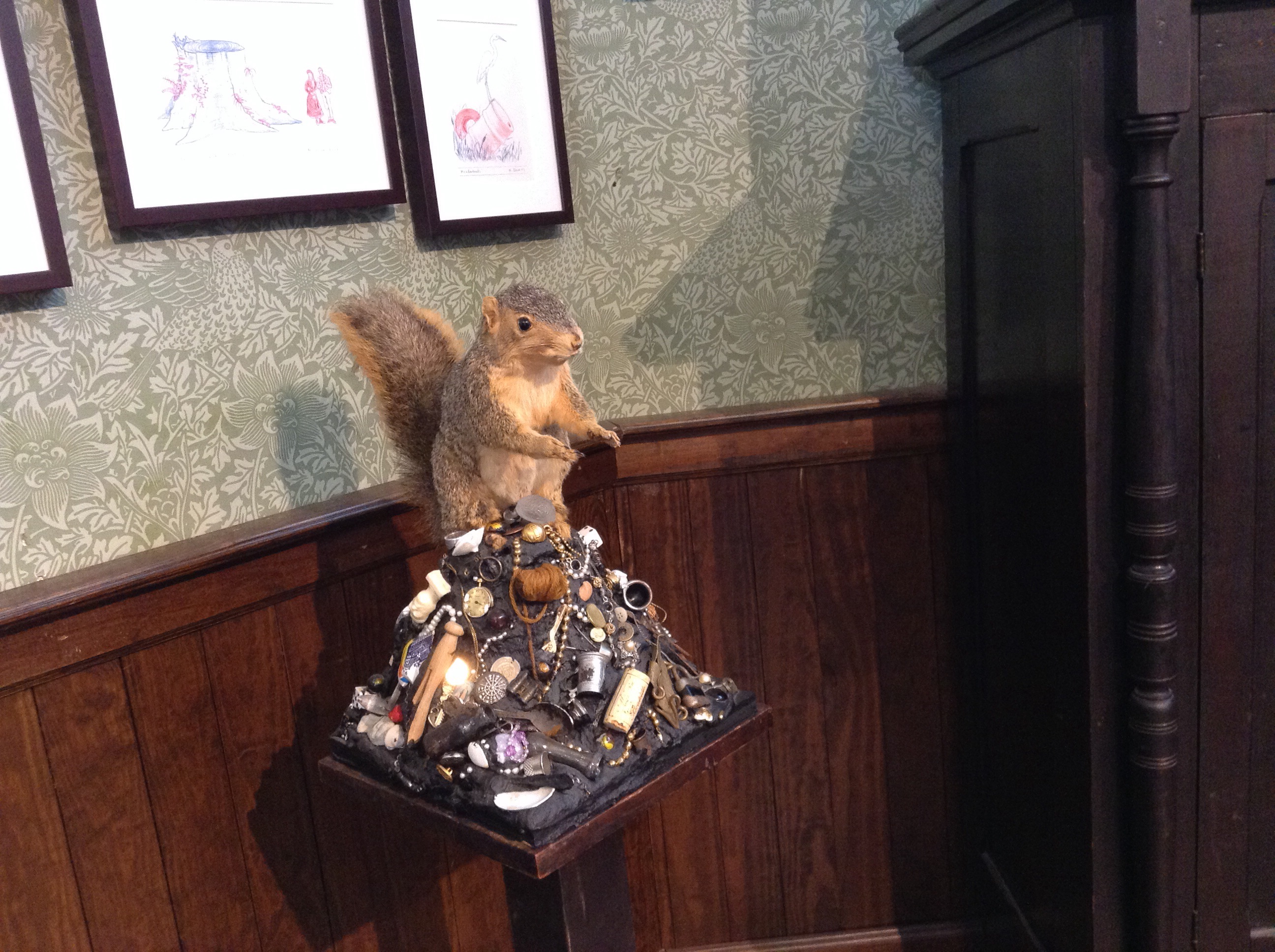 I really detest squirrels! No, but I really detest them! I hate how they eat just a bit out of one apple after another. I hate how,they look at me as though they think I’ll feed them. I hate how they look at me with that manic glazed eye that recognizes at last my enmity. That’s why I was surprised to see this guy in the Mass MOCA when I visited Massachussets recently. It surprised me to see this rather appealing specimin ( I am trying to be fair here) in a sort of ” room installation”. It was disturbing because I am rather a pack rat myself and have none of the clear minded sang froid that allows some friends to pitch out anything useless. I keep old books. I turn old clothes over and put them back in the cupboard….just in case! Paper clips, balls of string, strange chargers for obscure electronic devices, odd crockery, a full button box, boxes of old photos that will never be transferred to CD’s……maybe there is more of the squirrel in me than I like to admit. Maybe that’s why I detest them so?!