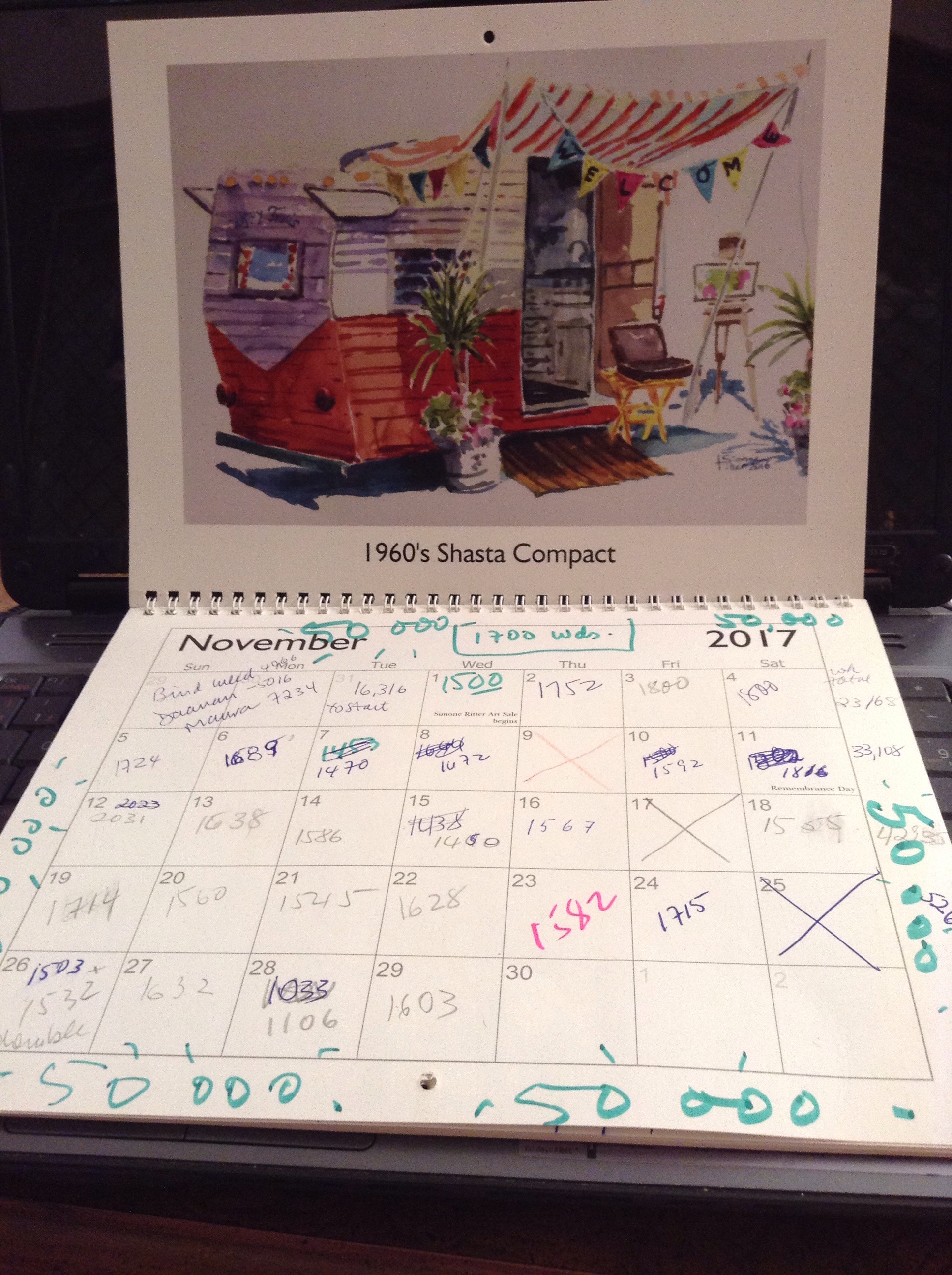 Ever heard of this? Neither had I until last year when I was too lazy and unmotivated to produce the 1500 to 2000 words per day to give me some sort of mish mash that is to be edited into, ta da! a novel. Well today is the last day and I still don’t quite know how I will get the father of that murdered guy to forgive the perpetrator ( who is the hero of the story, btw). I have over 60 thousand words and I am glad of that. The numbers are how many words I did that day.