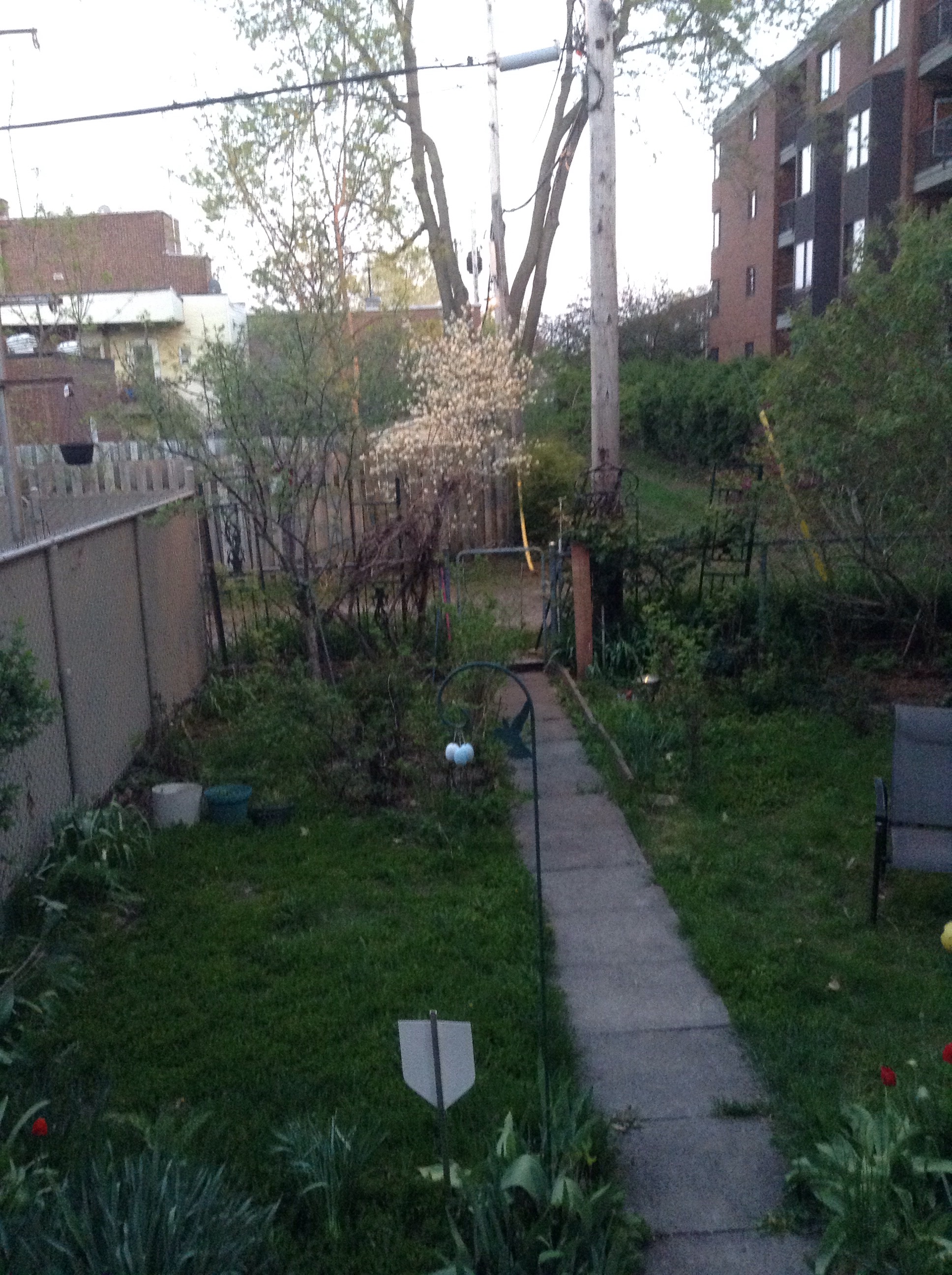 Sometimes it seems to me that Spring blossoms give off light. This little Saskatoon berry bush in the city lane outside my garden gate is glowing in the light of evening. The winter was harsh and the tulips late and sparse but this is a consolation