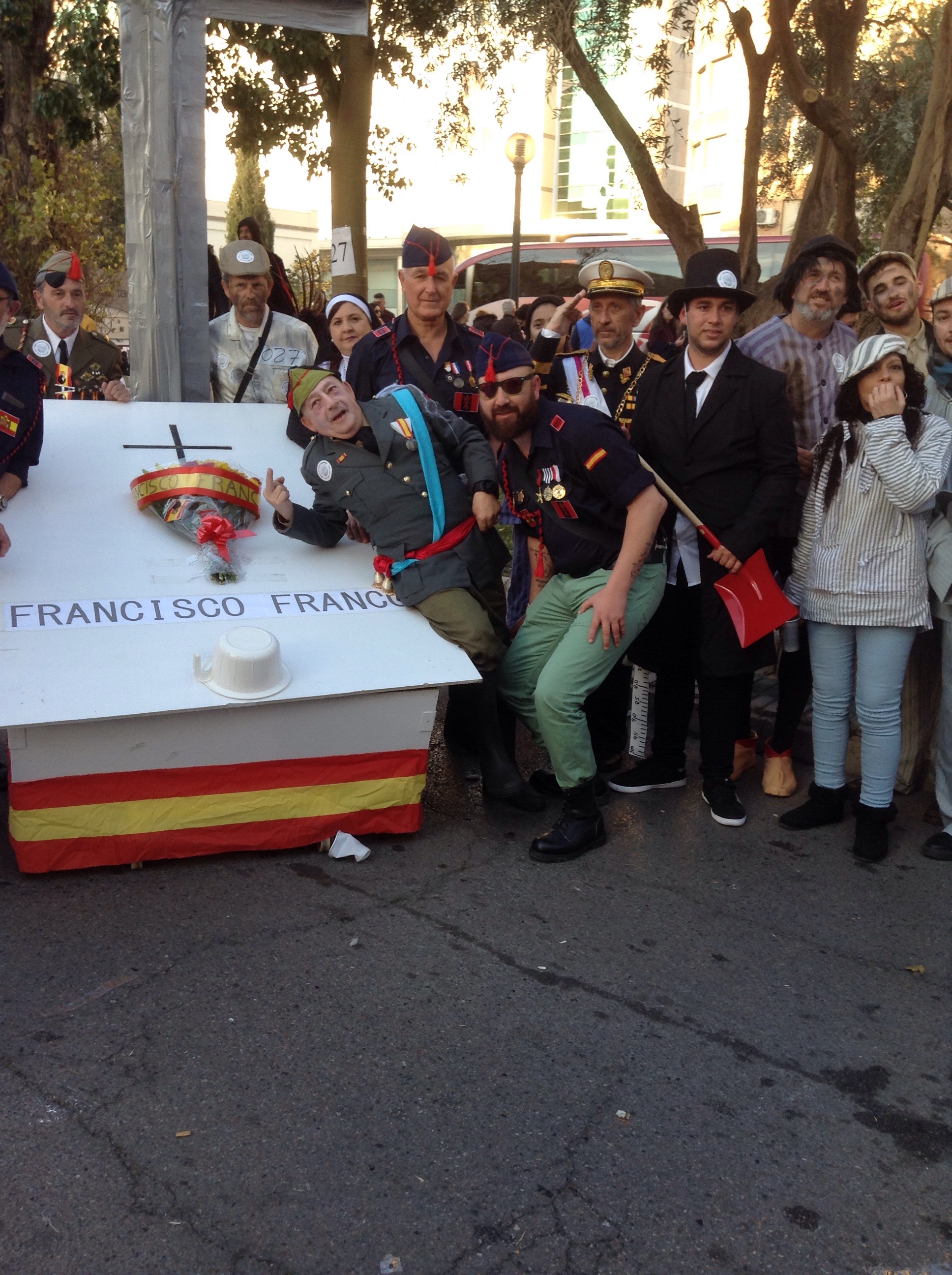 We spent a few days visiting this ancient city recently. Yes, it’s named after Carthage in North Africa and it has a marvellous ruin of a Roman theatre Last weekend was carnival weekend and I was astonished to see the energy and sheer number of people engaged in the carnival parade. There were a lot of very scantily clad ladies with huge feather headdresses but—seen one, you’ve seen ’em all! I was more interested in the political side of things. Spain is in the midst of a debate about the remains of Fransisco Franco, the general who ruled Spain from 1939 until his death in 1975. I am learning a lot about the Spanish Civil War and also about Franco …..I’m not getting into it! OK? A vote in the parliament last year approved the exhumation of his remains. Not so fast, where will he be buried then? The grandchildren of Franco oppose the move and propose that their ancestor be buried in the Cathedral of Madrid. The Government fear that such a move would encourage veneration of Franco so they refuse this alternative. The government even appealed to the Vatican to help decide where he should be reburied. That’s why the pope appears in the carnival float. This topic has been a hot issue for several years and so…. the float.