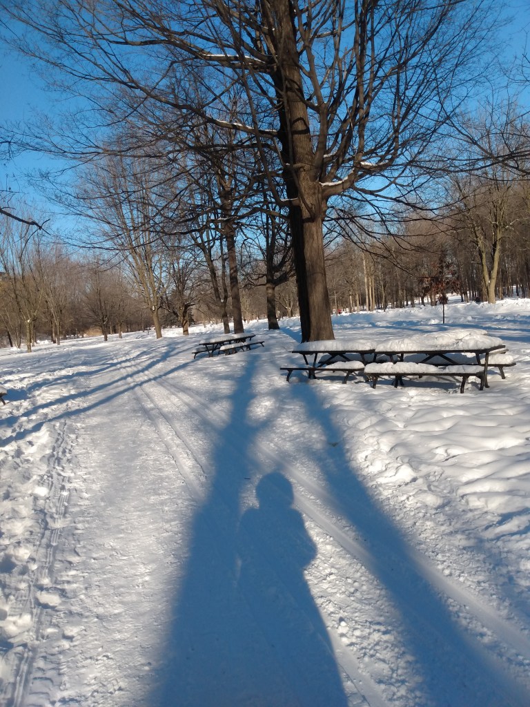 In the big park so close to the condo where I will move later this month only the squirrels are picnicking today. Suddenly I notice what looks like a dark pile of clothes on the pristine snow. As I approach, my shadow long before in the winter afternoon, I see that it is a person stretched out on the snow, face open to the brilliant blue sky. ” Who is this?