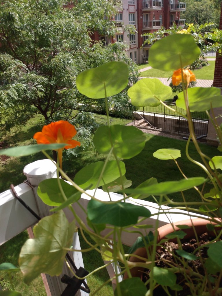 Later that evening I felt a little blue. What was I thinking? was I really going to go on this adventure, and come home unscathed? But the next day chance sent me a pick-me-up. I have a few plants on my city balcony, among them this cheerful nasturtium. I heard a faint buzz and glanced out to see a little bird. But he wasn’t sitting on a branch. No, he didn’t need a branch because he was a friendly little hummingbird who looked right at me and then flitted away. My plant only has two blooms but he had found them out and come to investigate. Something about his cheerful resourcefulness made me feel better. He wasn’t giving up. He was managing and taking care of his business.