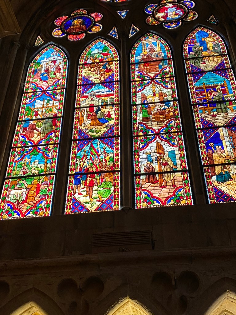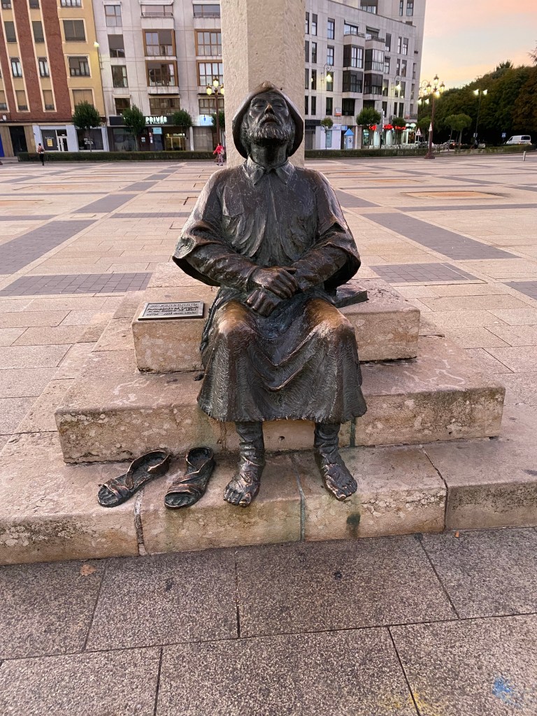 Now it can be told! I fell in Leon as I gazed at some ceiling murals purported to be the “sixtine chapel” of the Romanesque era . Included in the experience was negotiating some Middle Age type steps and … I didn’t negotiate so well. Down I went on both knees and I now have spectacular stained glass color knees.