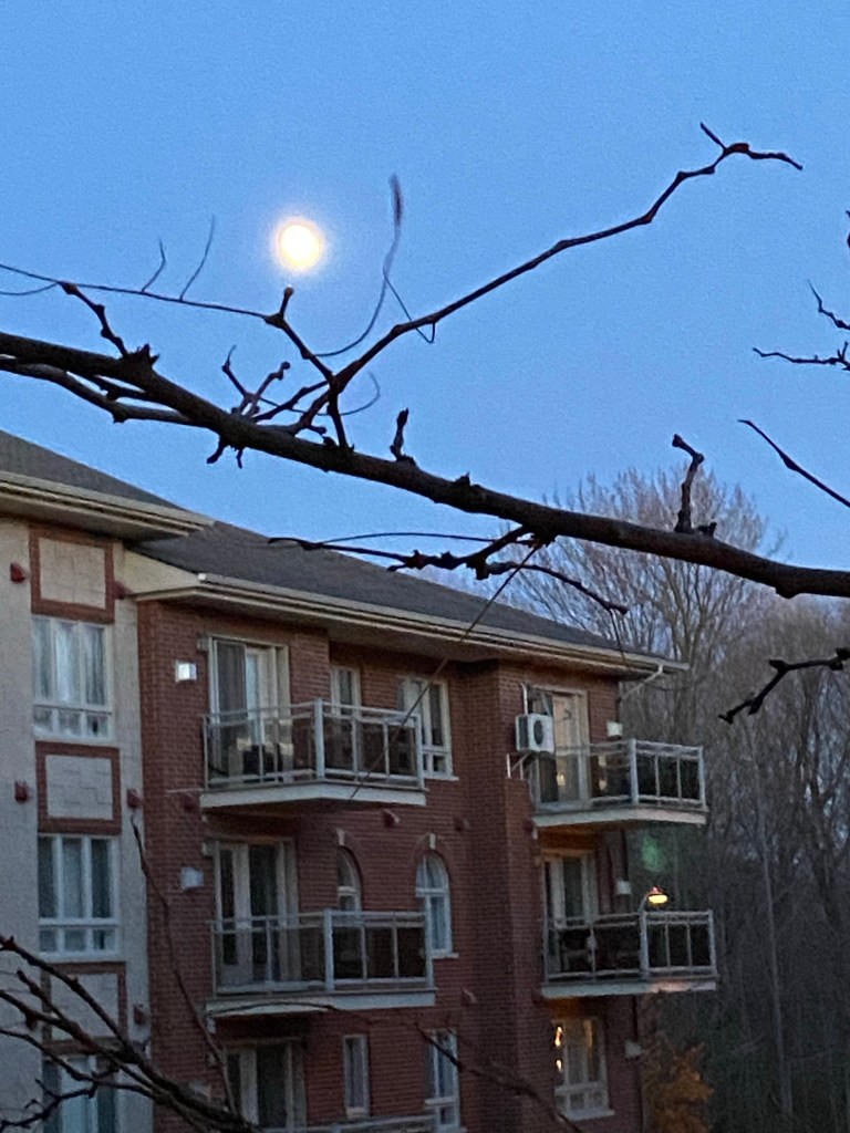 I had hoped to send a picture of the full moon from my balcony to a site called “ view from my window” but really! Compared to some of the splendour or cosiness or lush beauty S ome people look at, mine is very banal. I know, I know, practice thankfulness. Most of the time I do and I really feel it….but…. dark at 4 pm, snow yesterday and freezing rain today’