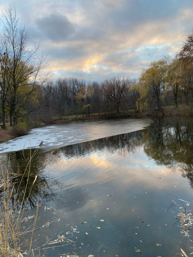 And it’s beautiful. Close to my home is a large park. Today as I walked through to go to the Metro I noticed that the pond was starting to freeze over. The reflection of the few leaves left on the trees will soon disappear but the sky was still lovely. After a dark and dreary day, the clouds lightened up and colour from the coming sunset softened the mood. The Canada geese have left and the fat squirrels are almost manic in their search for food for winter. I confess to hating squirrels, a hold-over from my gardening days when they were my mortal enemies.