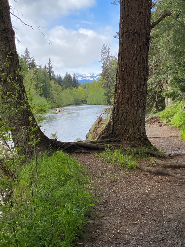 Not often I glimpse a view of the Rockies when out for my walk. My daughter’s home on Vancouver Island offers this treat. I walk down beside the swift-flowing Oyster river until it joins the Straight of Georgia. It was quite muddy in spots as it rained heavily in the night but the high winds forecast did not appear.
