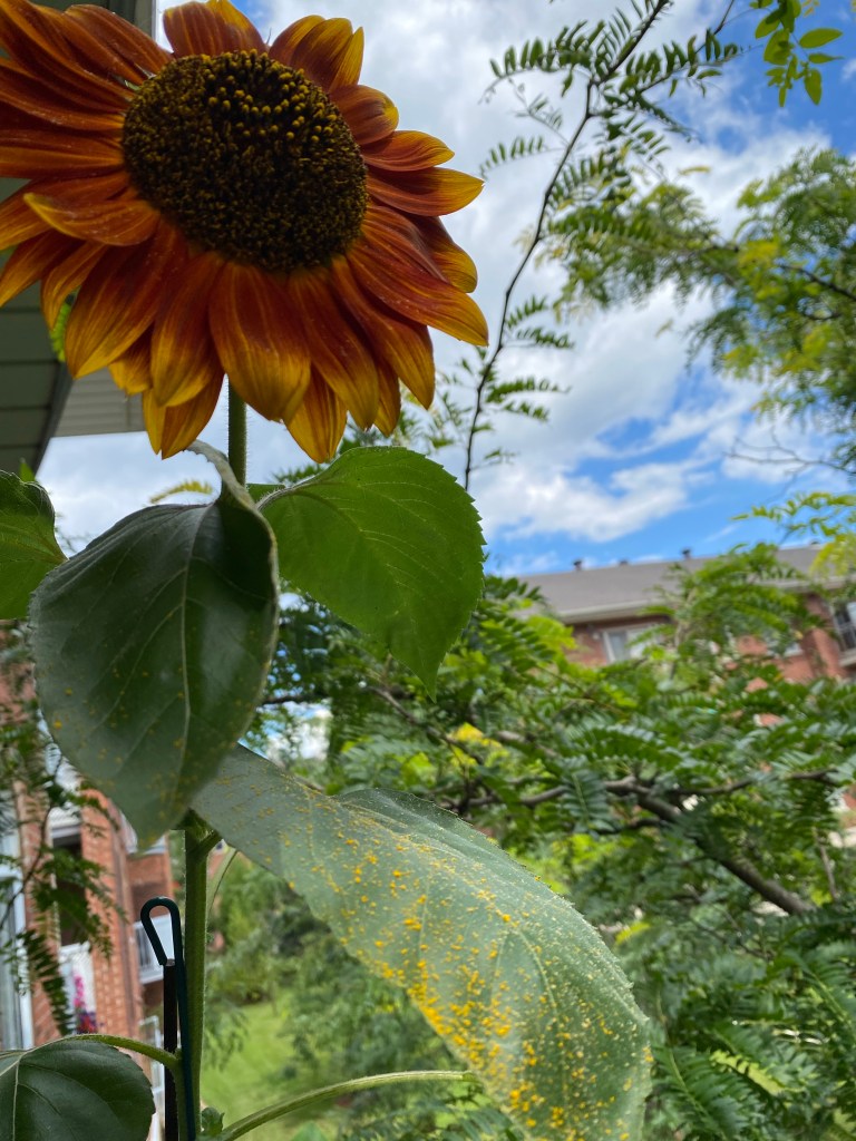 I didn’t even know they did that! The Montreal summer has been alternately cool, rainy, stifling, brilliantly sunny and now, at last as the August moon conquers the sun, the days are sunny, warm and decorated with demure white clouds. Finally, of the several sunflower seeds I planted in pots on my balcony one has shot up and delivered its golden rain of pollen. Will it have time to make a crop of seeds I wonder?