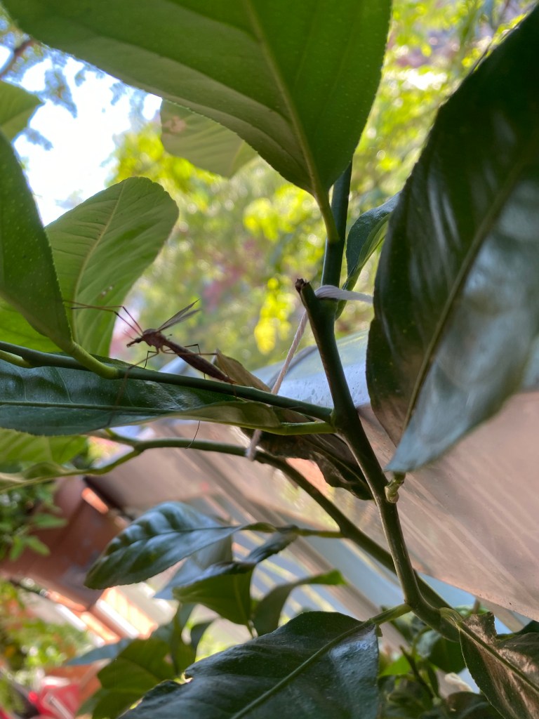 A dragonfly perhaps? Sitting in the shade on my lemon tree that steadfastly refuses to bloom, you are the pale and diaphanous detail that deserves a greeting. Much you care for my greeting! You have your own vital tasks to attend to. You are like the fat white spider who haunts my astonishing geranium. Astonishing because it was a collection of dried-up old sticks in a paper bag in my storage cupboard all winter. Now I can hardly keep up with trimming its crimson flower heads.