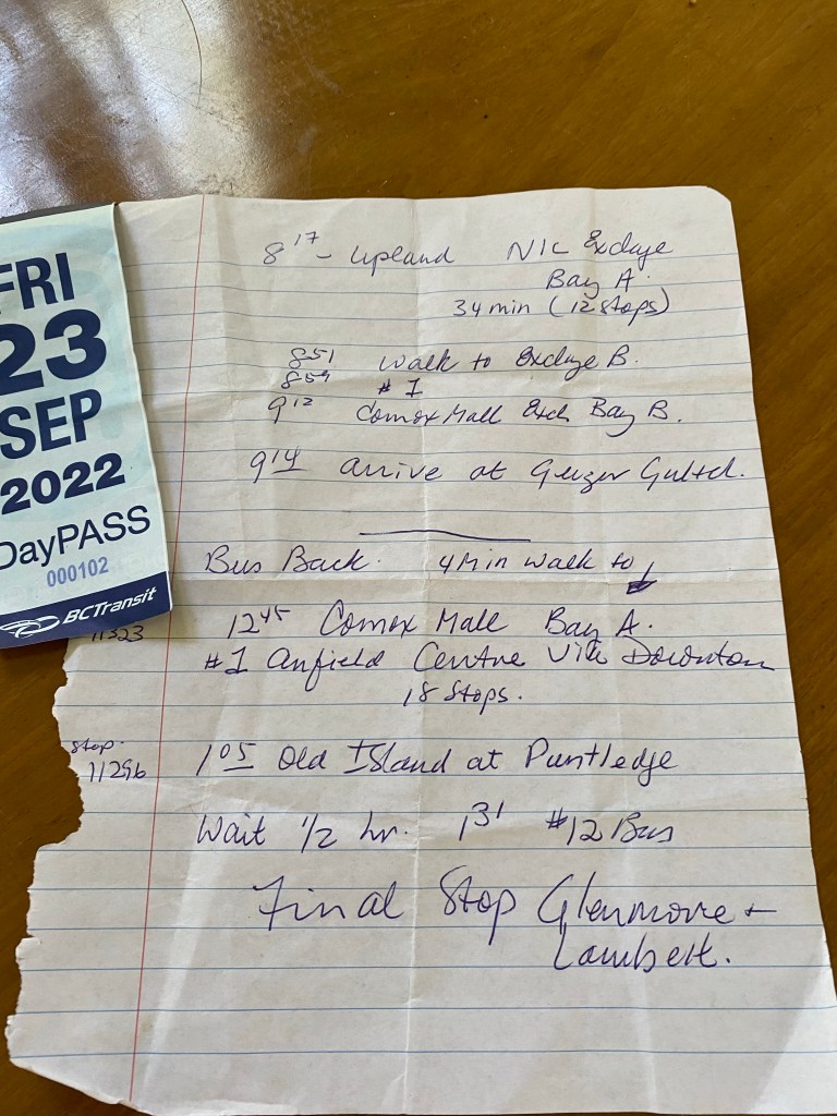 I am staying with my daughter in a semi rural community on Vancouver Island. I really enjoy walking the many beautiful trails close to her house. However, there comes a moment when one starts to talk to ravens and then one realizes it is time to go into town. My daughter works and drives in so …. after an hour of poring over the website of BC Transit we decided on a tentative bus route. Much as I appreciate the web, I know myself and my various dyslexic quirks. I need the whole trip back and forth written down. Strangely enough I had to return by a different route than the one I went out on but….who am I to question rural bus companies.