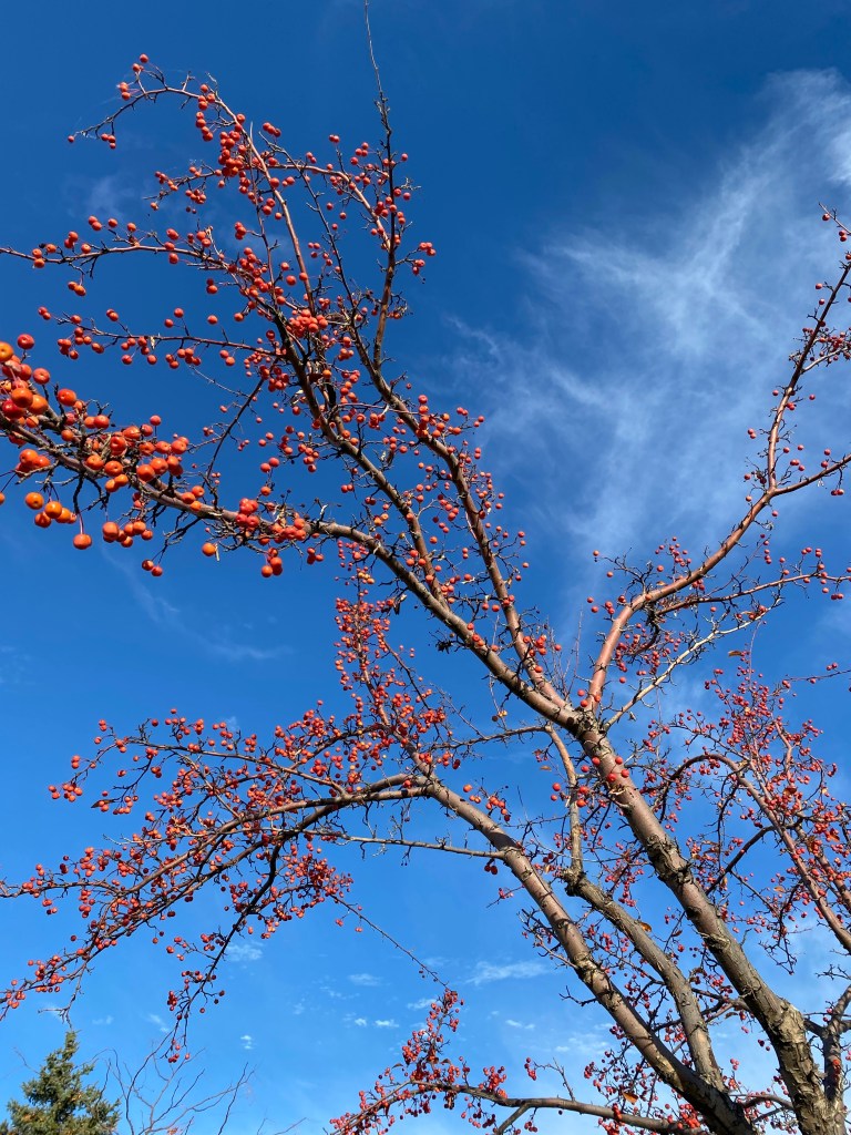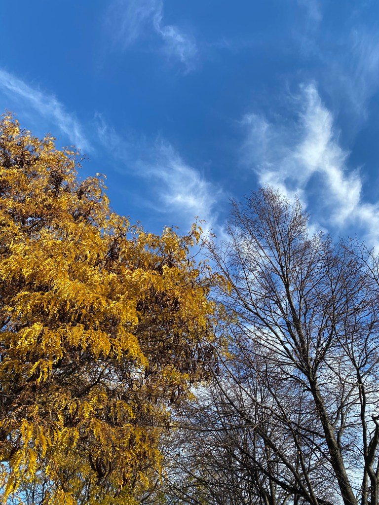 On an ordinary street between the banal tedium of the shopping centre and the struggling miracle of the big park all I had to do was look up. A row of modest trees that only a week ago were crowned with brilliant yellow leaves are bare now. On the other side of the wide walkway that leads to my house a tree of another sort still blazes against the brilliant sky, decorated with beloved clouds. I only had to look up.