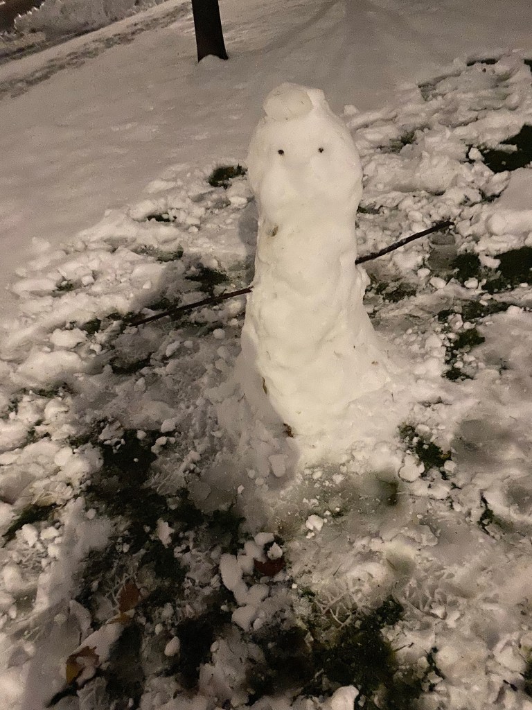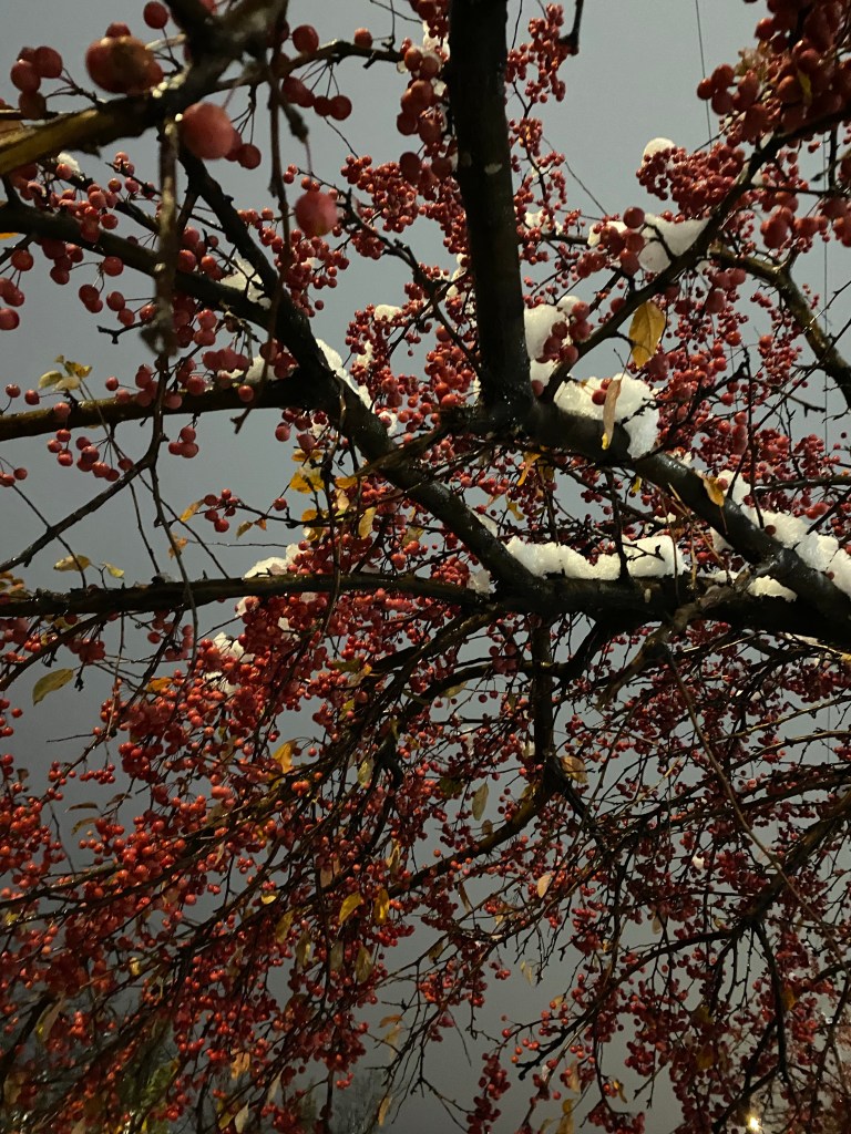 By the time I met my goal of 10k steps evening was making its early appearance. Fruit, snow and streetlight – quite the combination