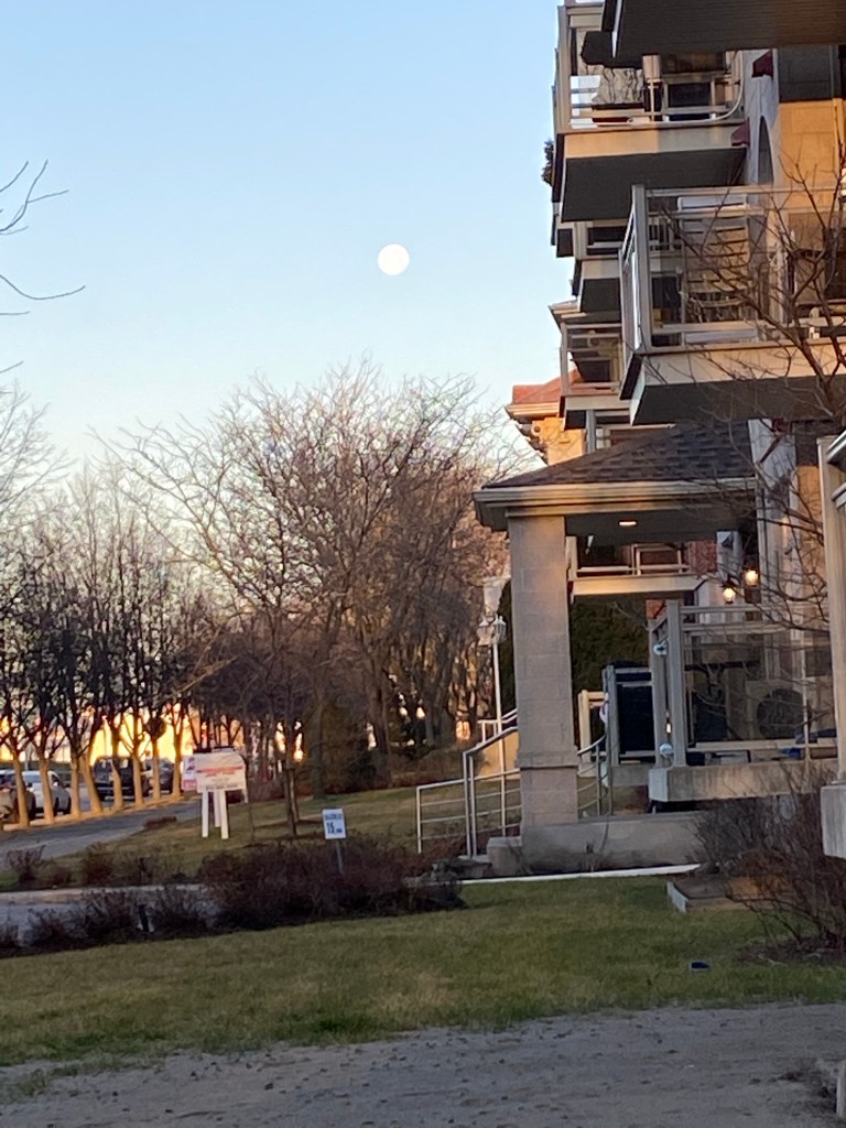 Early in the day, the moon slips quietly down below the horizon. At night she is the great lantern that reigns over us. We stop for a moment in the cold street to bow to her. As the sun lightens up the dark sky, she fades and timidly slips down to the horizon.