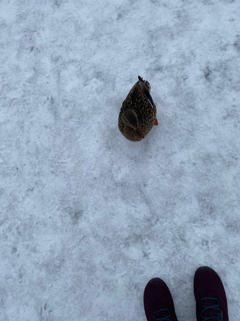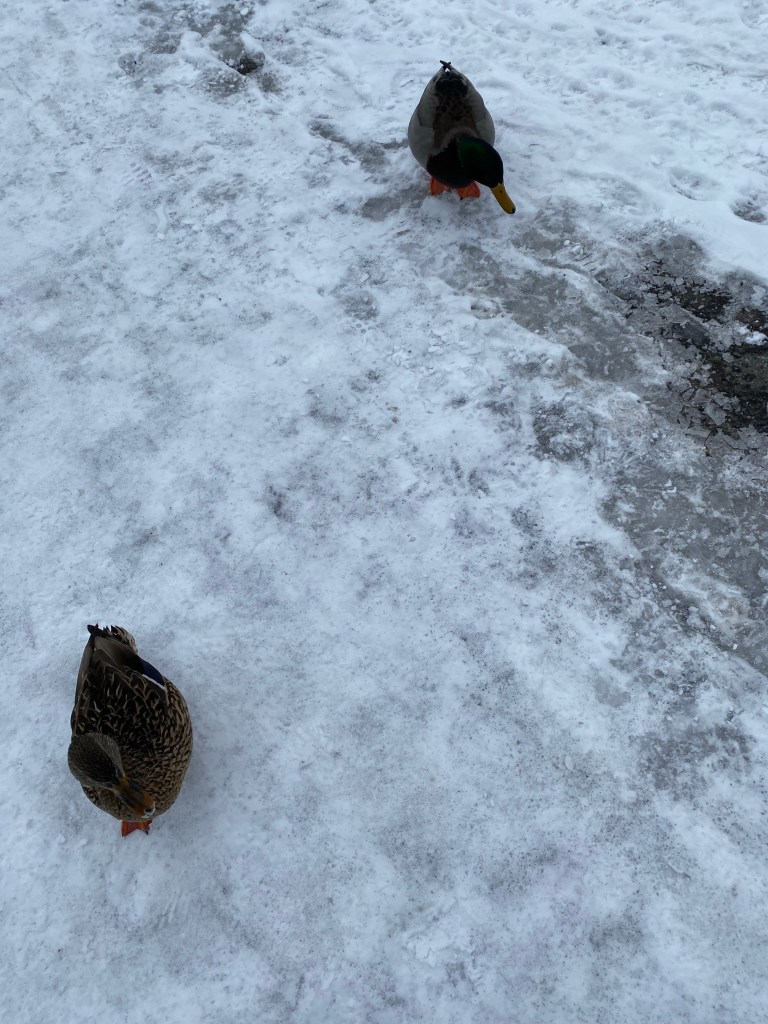 And here on the way were many ducks, out of the water and exceptionally wandering around on the path. I often thought of this flock of ducks during our harsh winter and particularly during the intense cold of last weekend. Their webbed feet, their difficulty in finding food, all nagged at me. And here they were, rushing towards me asking for food, it seemed to me! I didn’t have anything to give them and so, foolishly perhaps, I promised them that I would bring them something from church.
