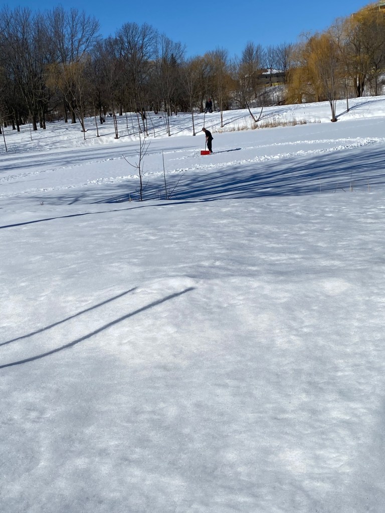 Says the little red drop on the map of my neighbourhood park. You are here in the unseasonable sun, the snow melting around you and the sky as blue and clear as the dome of heaven can be. You are here and yet someone who unexpectedly hugged you tight two days ago is not. She died suddenly and will never be here again. On Sunday when I went to church to hear the gospel of the Prodigal Son, a woman I knew came to speak to me during coffee hour. She was happy and celebrating the tenth anniversary of her son having been declared cancer free. He is still a young man. She is…was ten years younger than I am now. We talked a little about coping with bringing up a child with health issues. As I was leaving she suddenly hugged me close. There was a tremendous warmth in that unsolicited hug. When I found out that she had died, on Facebook, if you please, I put on my boots and went out to walk in that miraculously beautiful afternoon. I wanted to be sure I was “ here” I slipped as I walked on a patch of ice and my walking poles “ saved” me. I was still here and still upright. A man was clearing a heart shape on a pond. Why? To show his Valentine? The ice held and he didn’t fall in. He was still here. How fragile everything felt.