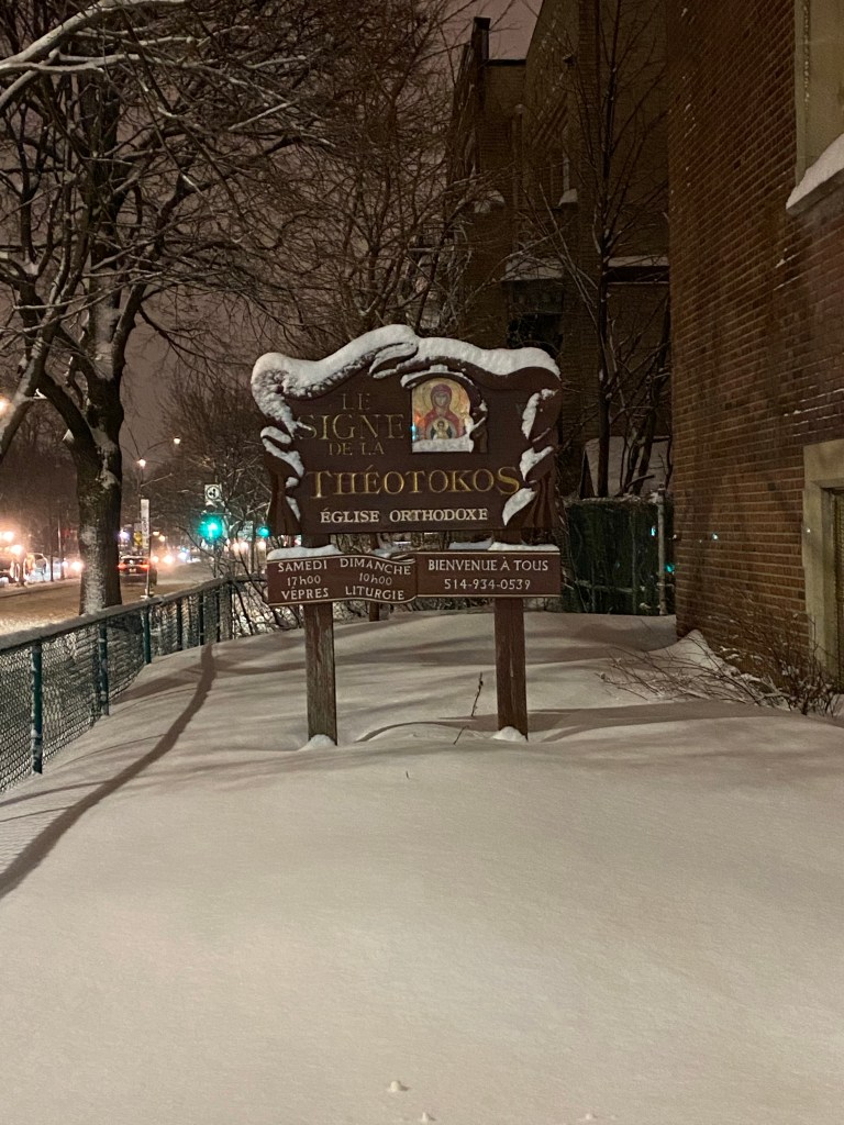 It has been a gloomy winter. Winter decided to brighten things up with almost 24 hours of snow. Lent is starting. On Monday and Tuesday night the Canon of St. Andrew of Crete is read and chanted in Orthodox churches and so it was this week. On my way out of the Tuesday service I thought how beautiful the sign outside church looked. It was carved about thirty years ago by a talented woman who lives in the United States. Nature outlines the fluid lines of the carving.