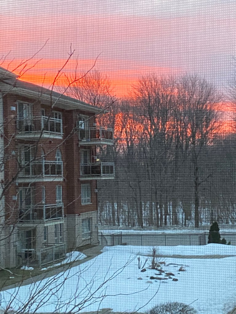 The building is a banal condo block. The bare trees are part of the boundary of the big park a few steps from my own condo block. And the sky? A minor miracle that, given the right combination of mysterious atmospheric conditions, reminds me of the beauty and joy in this world. If I want to capture it I have to be conscious and present. I have to take the picture because, in a few seconds it will be different. It will still be beautiful, but not quite this glorious. Timing, the right moment to take a picture, to speak that word, to open the door.