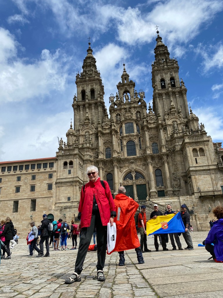 When I did my last Camino I never got a picture like this . As I was walking across the square someone called me. It was a lady whom I met in the Montreal airport as we were both setting off on our Caminos. We struck up a conversation for a few minutes and she recognized me as I walked across this famous square. I took the opportunity to ask her to take the classic picture and … here it is! My feet are not elegant but they are happy!