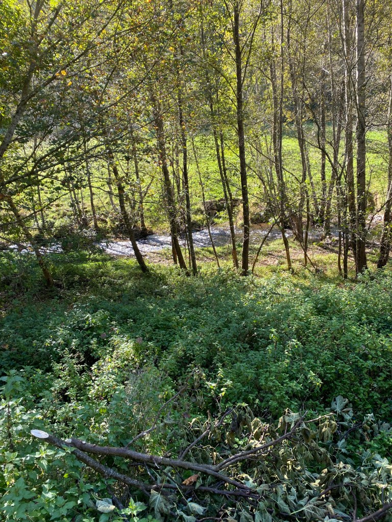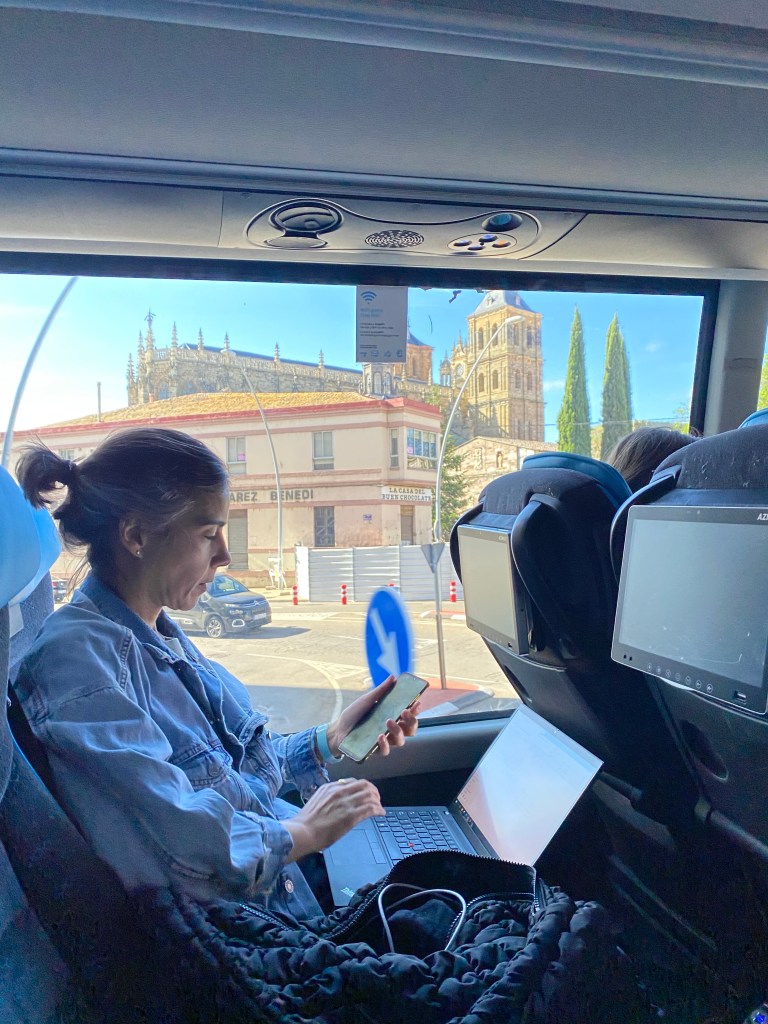 Peering down a steep slope, my face lit up as I realized the bus route was cutting through the classic Camino Frances route. I even caught sight of the way market with the half sun and yellow arrow on a bright blue background. It was set up in a rest area with picnic tables. I distinctly remember lying down in the cool grass there listening to the endless sound of the stream.