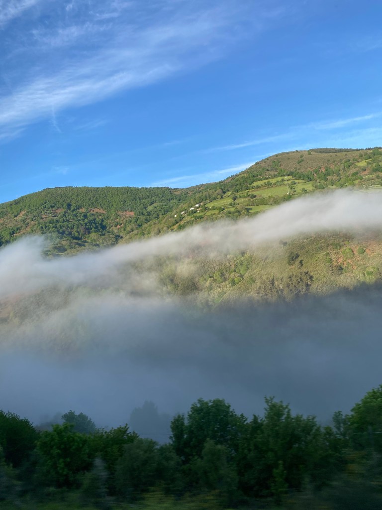 The day finally dawned about two hours after we set off and revealed this . Somehow it was familiar. As the bus took a slightly diagonal route, it was leaving Galicia behind. Daybreak unveiled spectacular mountains as strong sunlight burned off the mist. We drove through Astoria, the ornate cathedral emerged, unmistakable and a breathtaking surprise.
