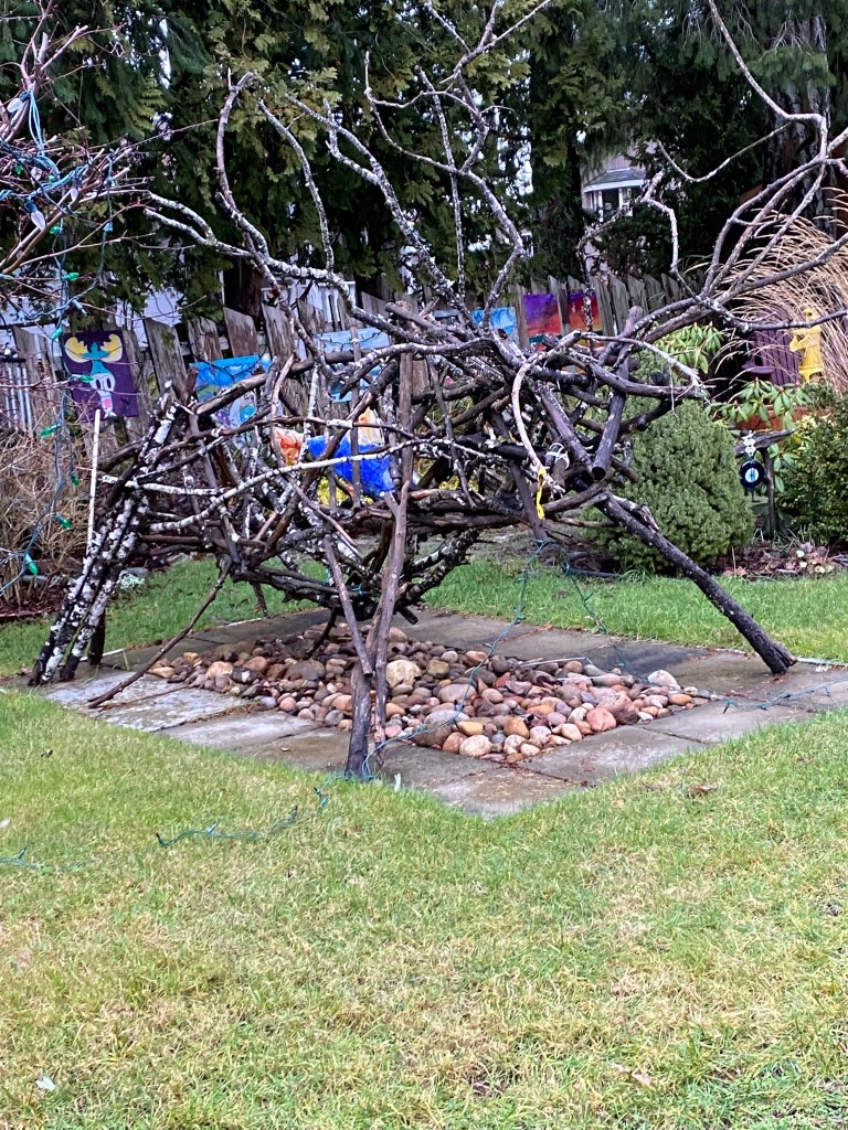 He looks very sinister to me. There was one of those tine “ free libraries” in that yard though and I got a brand new copy of a Joseph Boyden book so that was my reward for a 12 K walk on a gloomy day!