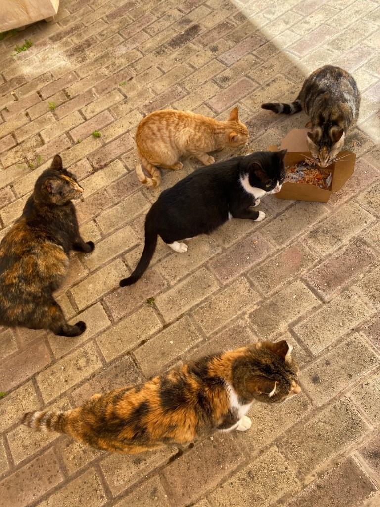 Katy fed me a delicious lunch of fish. The cats of the neighborhood cleaned up