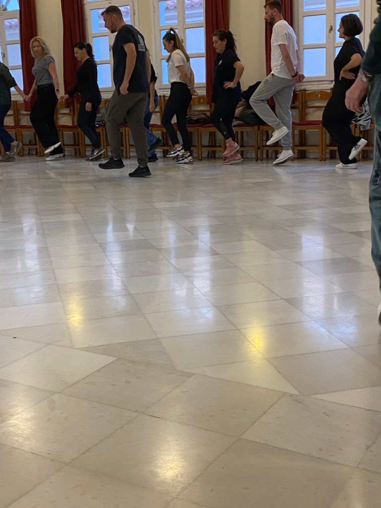 When I see Balkan or Greek or Russian dancers all dressed up and the orchestra banging it out I don’t think much about how they learned the steps. I don’t think about practice sessions but here I got invited to see what goes on in the dancing class. My niece goes twice a week and so do plenty of women of all ages and a sprinkling of men,