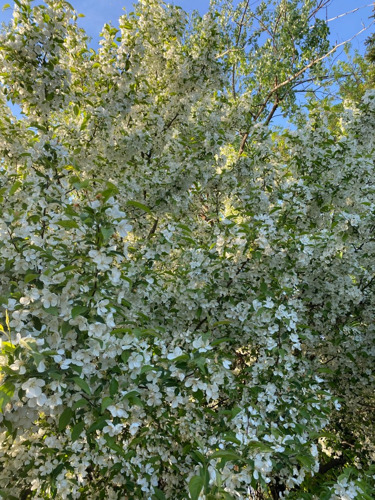 Although I was hot and tired from a lot of walking, I accepted a late invitation to visit the rapids near my home and was rewarded with the sight of a still blooming apple tree.