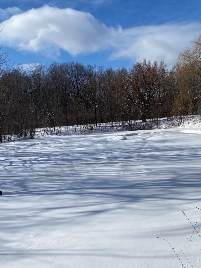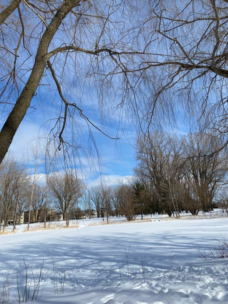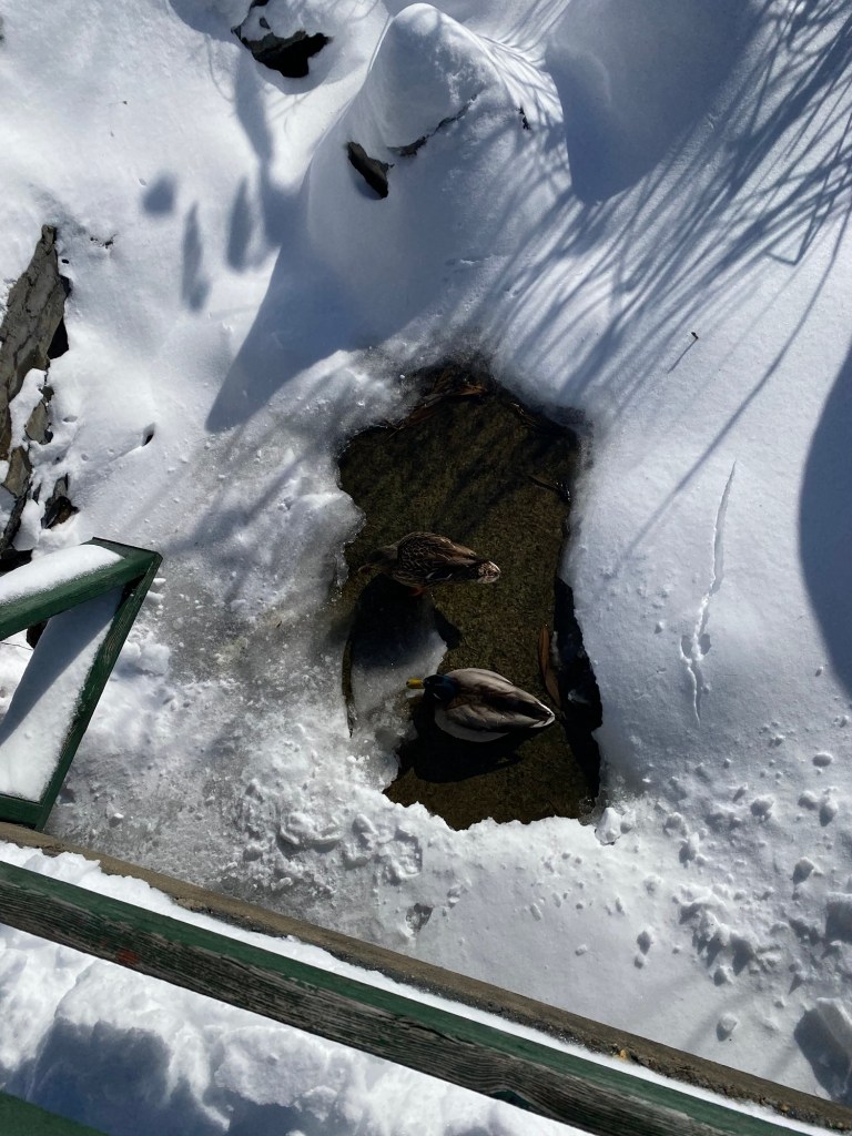 We’ve had a lot of snow and more is to come tonight. People are cross because their cars are stuck in the snowbank, in garages, in parking lots. I don’t have a car and so the only think I have to worry about is walking around on poorly cleared sidewalks or marching down the middle of the road with a ( pretty dead) ear to cars behind me. It’s beautiful though. Perhaps the few ducks who have managed to find some free water under the bridge might disagree.