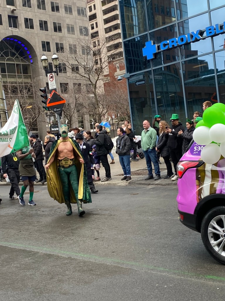 The bands, the dancers, a quiet Ukrainian group, pub floats and one for Bain Magique, fire engines, police cars, dignitaries from the United Irish Societies and representatives of parishes and Irish communities passed me as I waited to see the huge “ statue” of St Patrick. A kind neighbour finally told me it had started the parade and because I had come a little late, I had missed him. I had to make do with this rugby club super man!