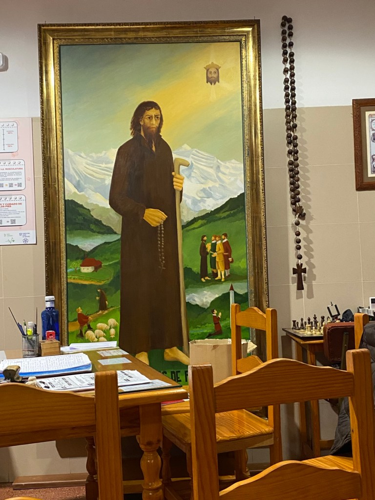 Who presides over the cash box and for those who plead “ no change” there is a bank card machine! A local Spanish woman was married to a Swiss who died. She donated the money for this Pilgrim Inn. San Nicolas de Flue. Strange saint who abandoned a family to pursue a live of monastic aesthetics. ( perhaps it was a blessing for his wife though)