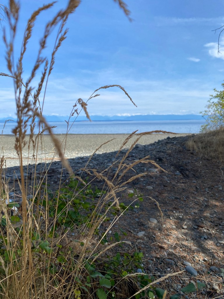 I have a favorite walk along the shore here on Vancouver Island. A lot of it is calm salt water of the Strait, bleached logs that make a long natural fence and the soft sandy trail carpeted with pine needles. But there are a few shady spots and there the damp air lets different life flourish.