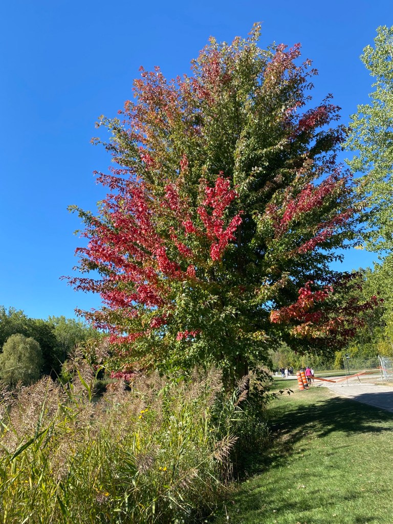 I was glad I had taken a rather delicate pair of potted plants in last night as the temperature fell to 4 degrees. No frangipani can be happy in that zone! Some trees leap right into the blaze of red that we Canadians are so proud of.