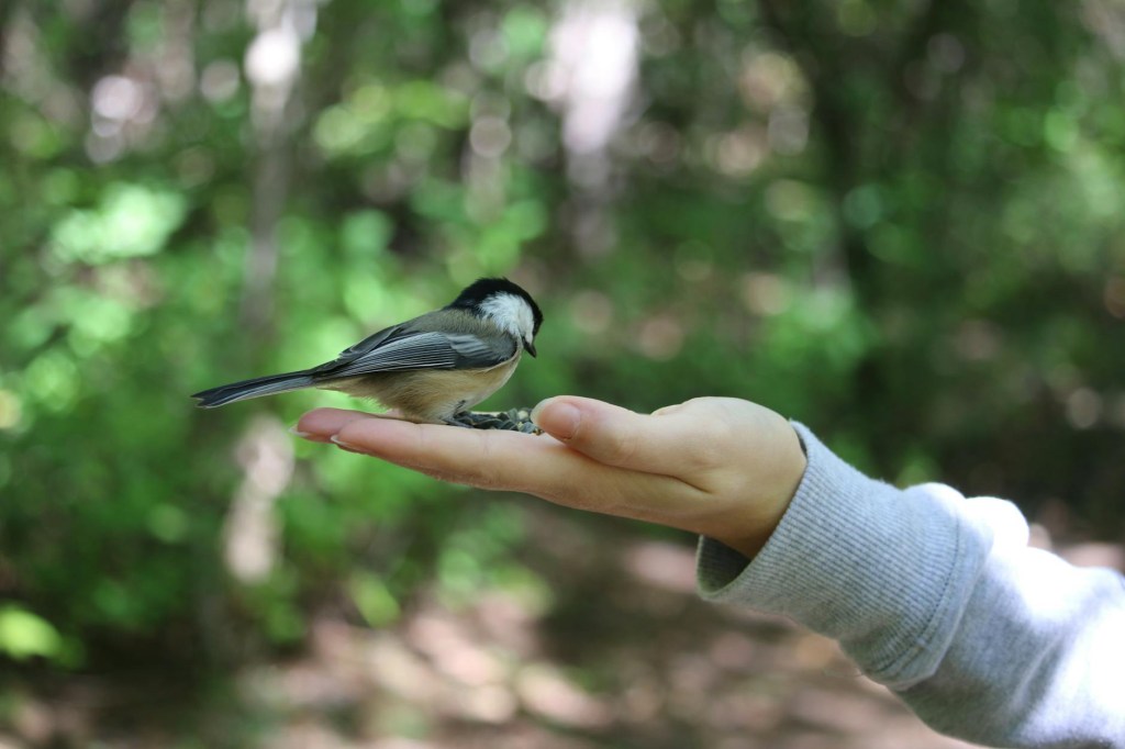 However, I decided to try one last spot off the trail. Well, it turns out these babies don’t just want you to shake the seed box, or even open it, or call them with a ridiculous imitation of their call. There was not a sign of a bird until I poured seeds into my hand and then … whoops there they were